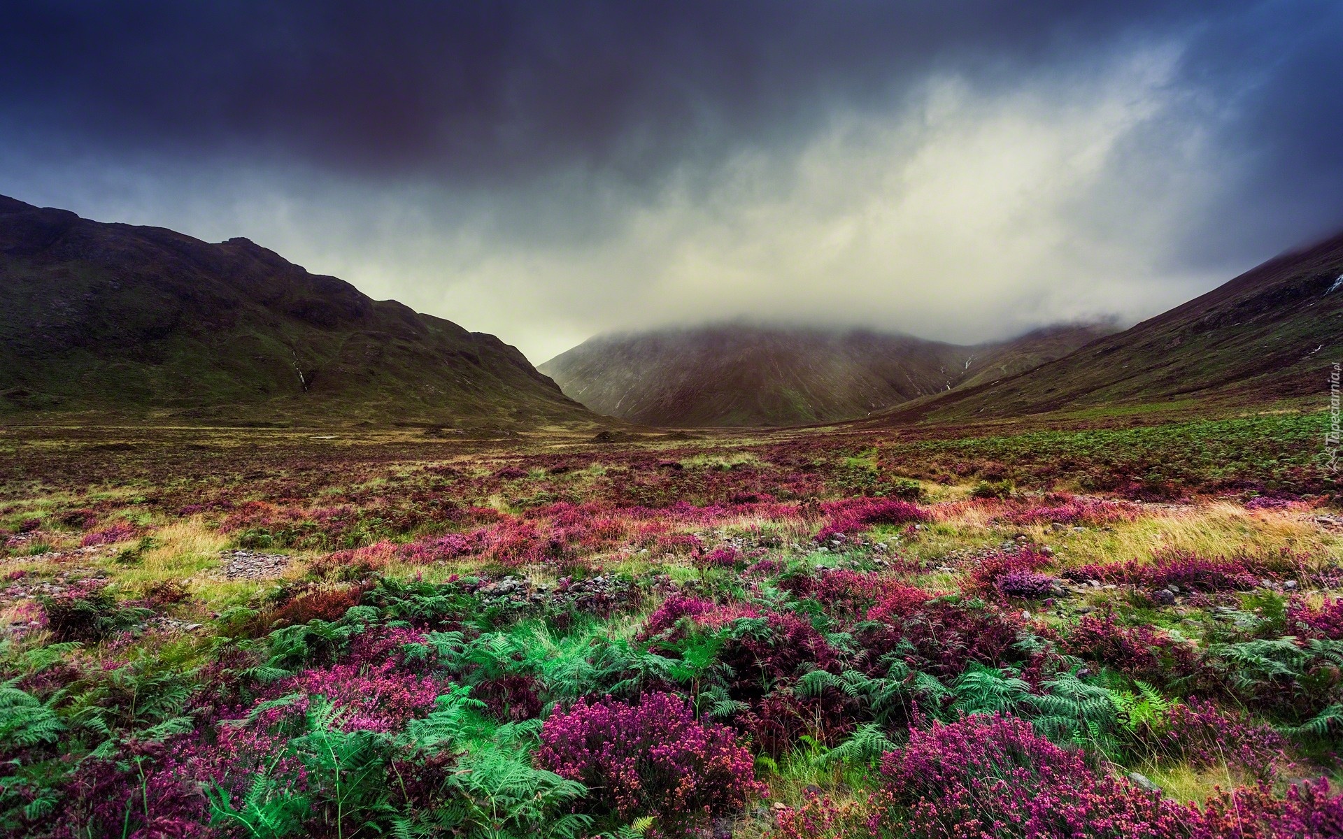 Edytor tapety: Góry, Wzgórza, Mgła, Paprocie, Wrzos