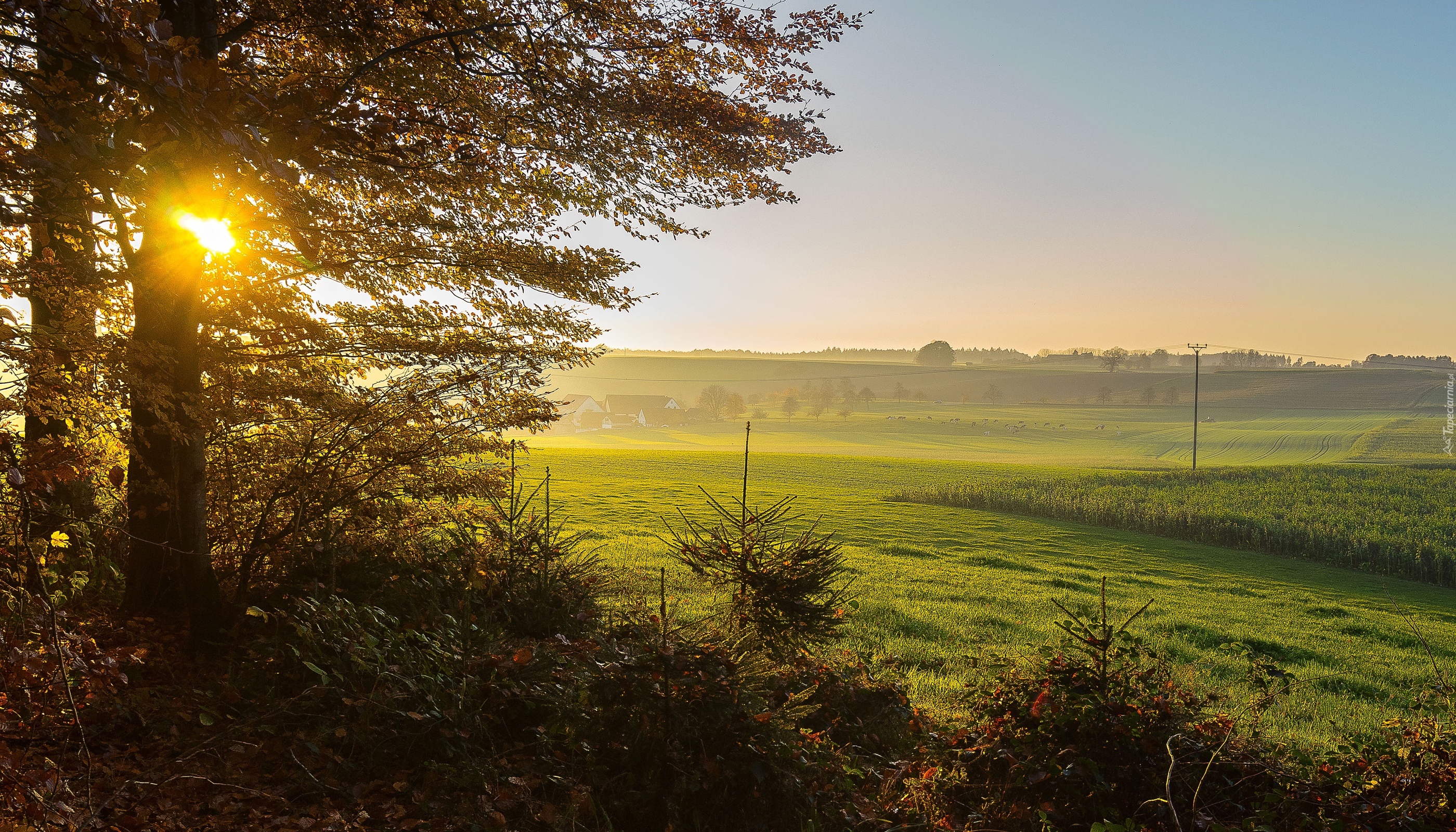 Edytor tapety: Wschód, Słońca, Łąki, Pola, Las