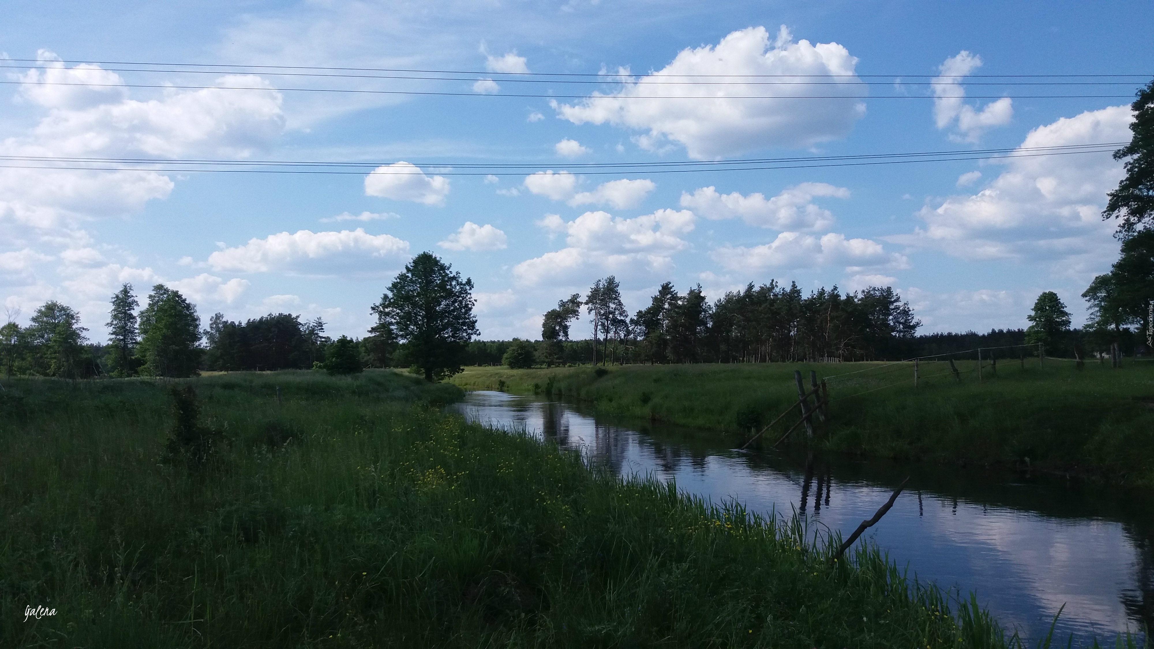 Edytor tapety: Rzeka, Drzewa, Niebo, Chmury, Łąka