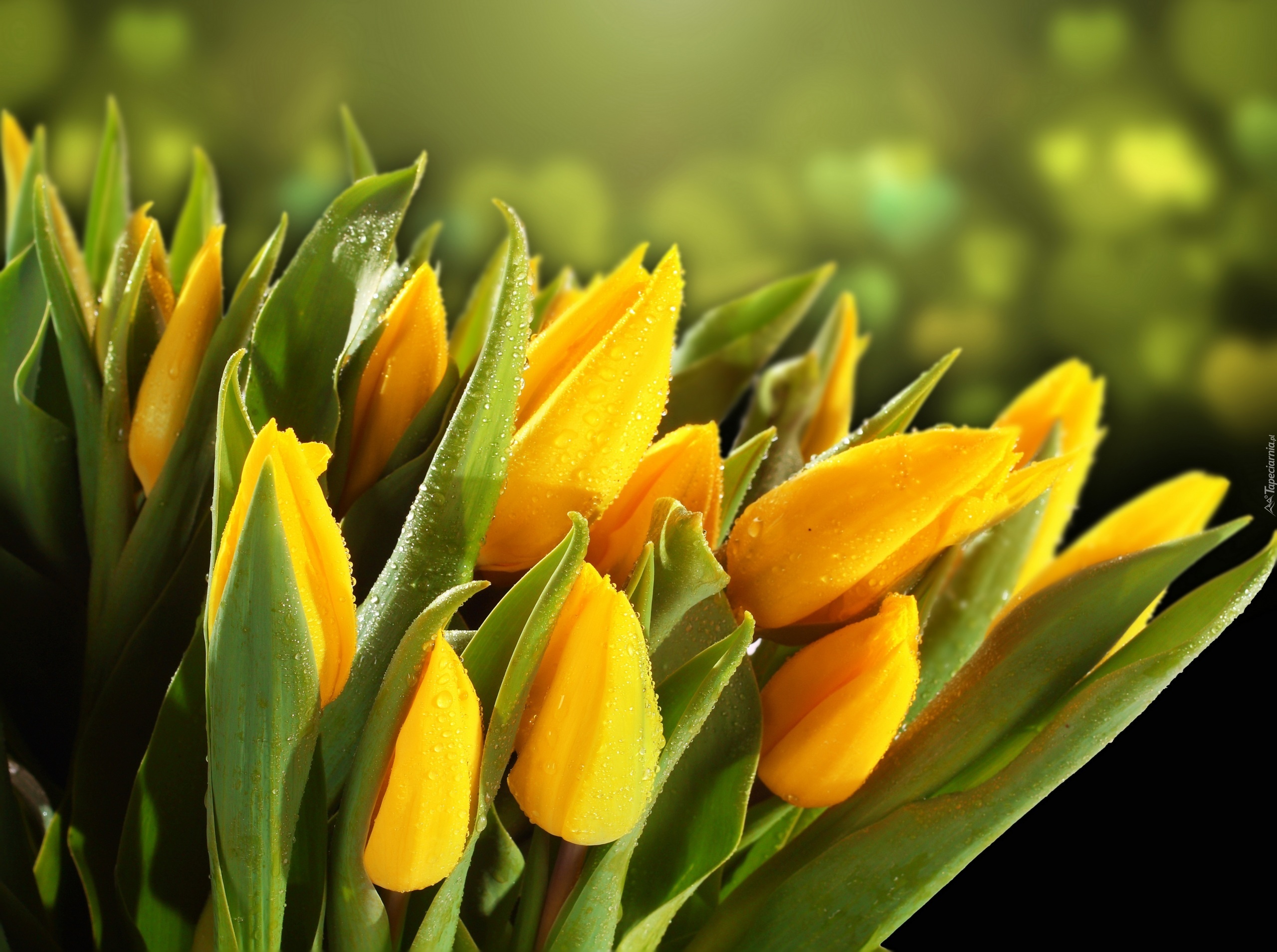 Edytor tapety: Żółte, Tulipany, Krople, Rosy, Rozmyte, Tło