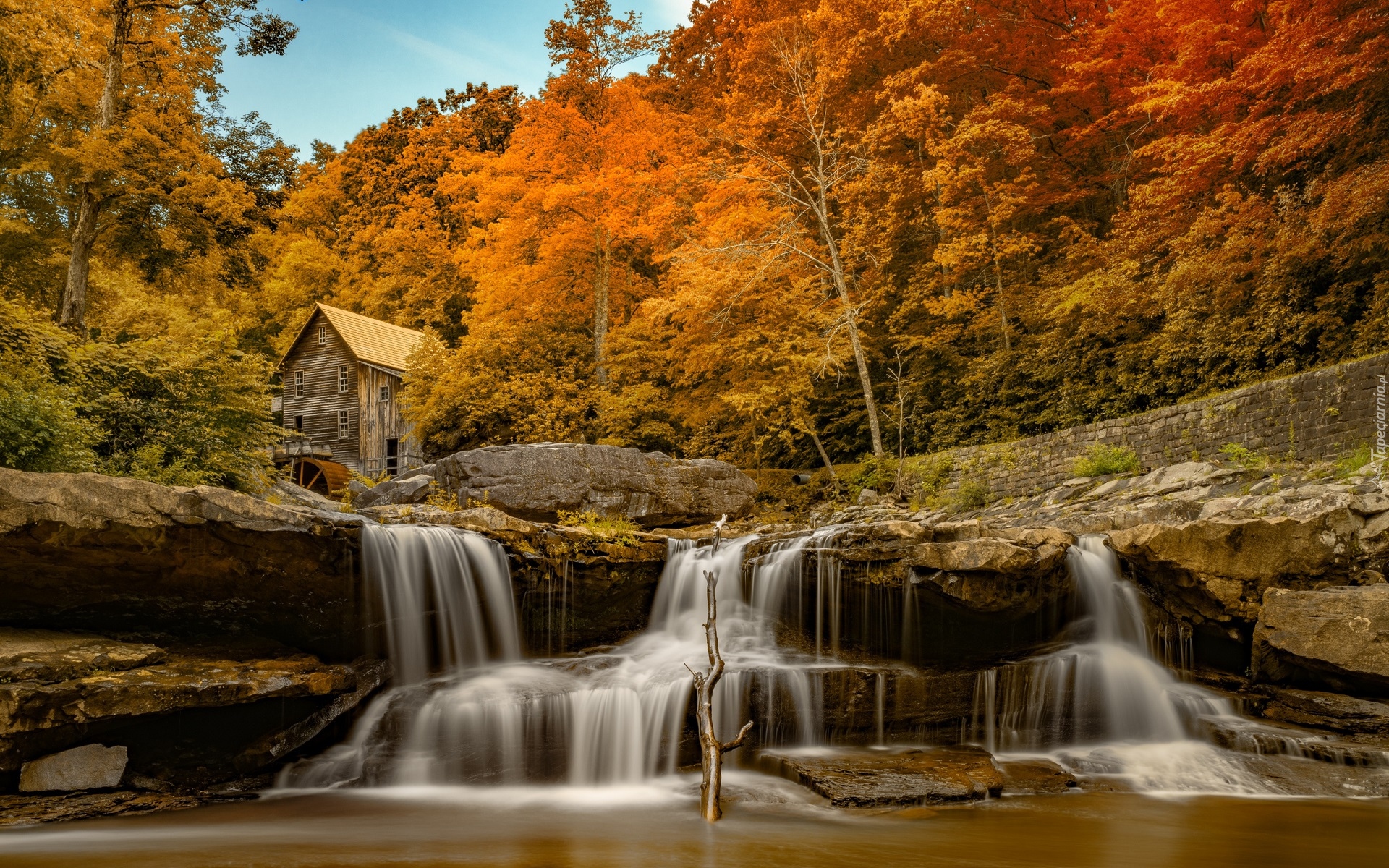 Edytor tapety: Młyn, Wodny, Rzeka, Wodospad, Las, Jesień