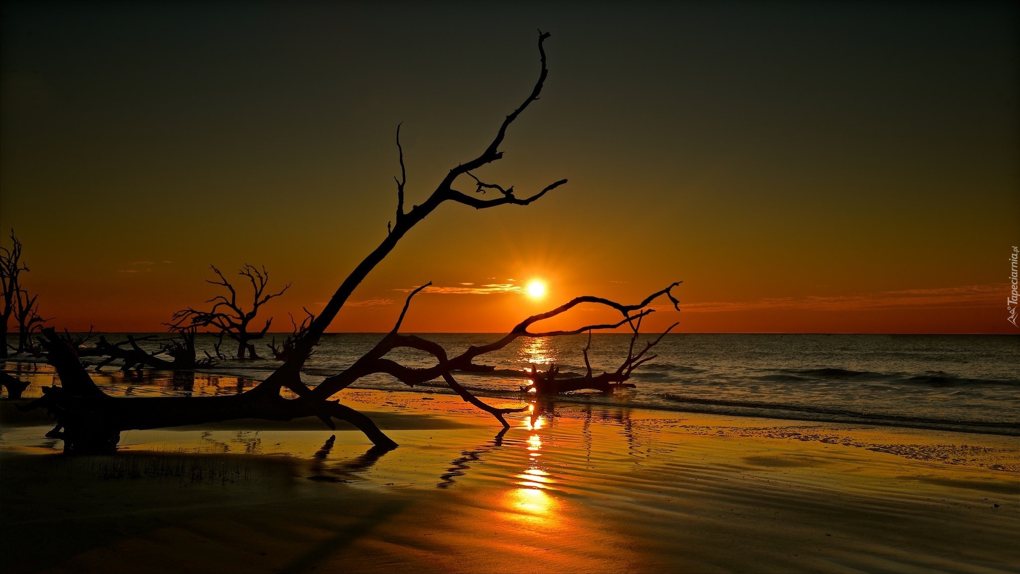 Edytor tapety: Zachód słońca, Morze, Plaża, Konary