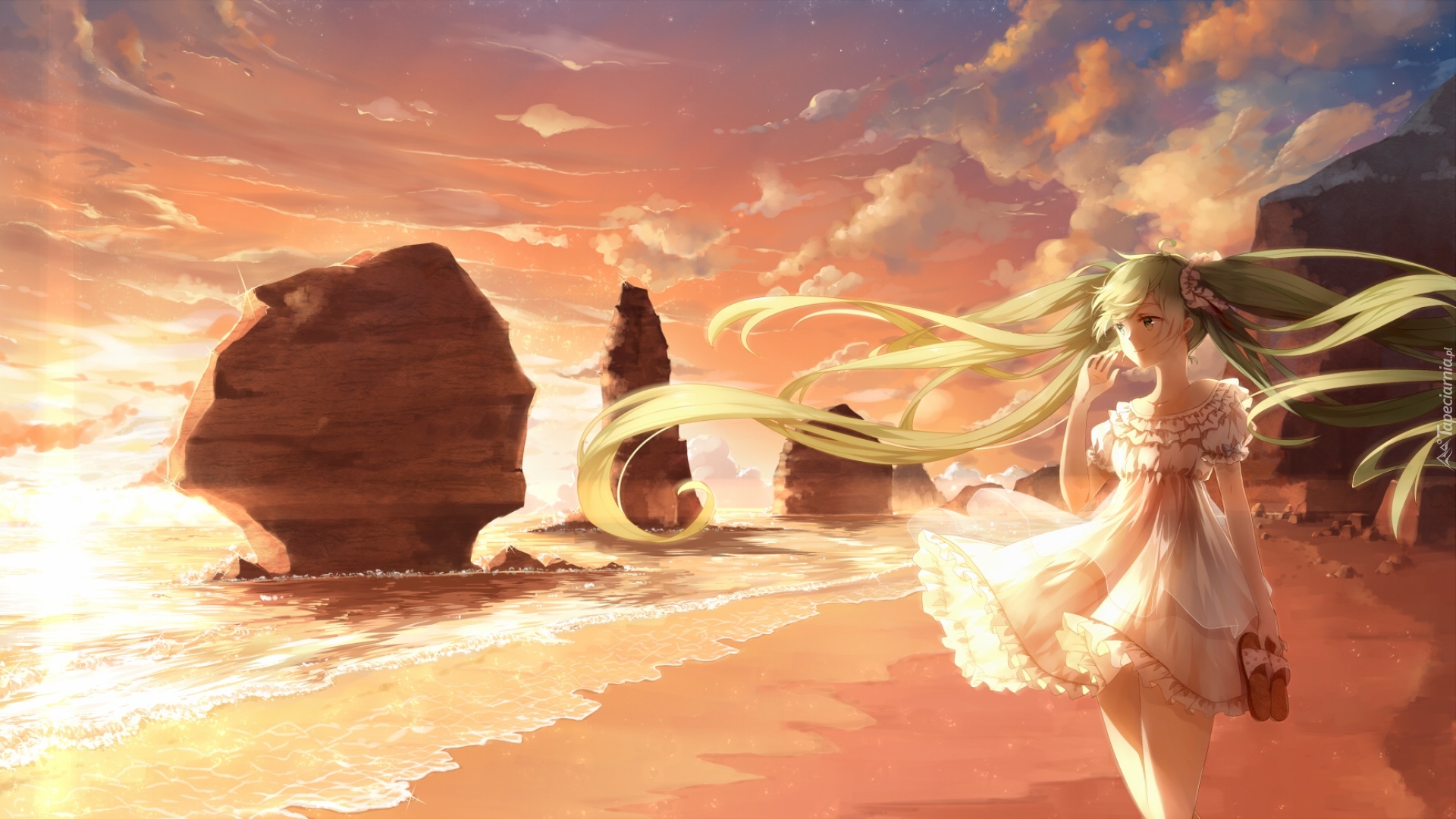 Edytor tapety: Dziewczyna, Morze, Skały, Plaża, Manga, Anime