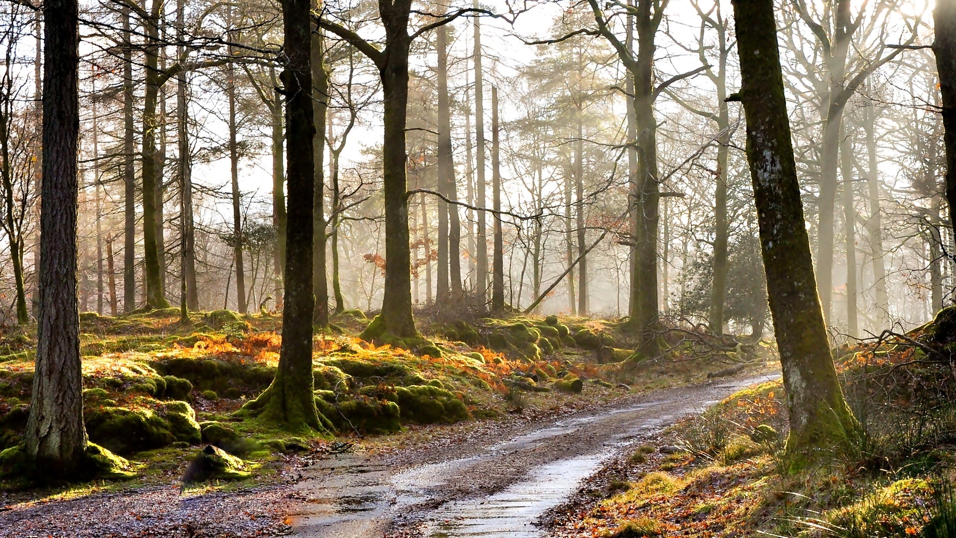 Edytor tapety: Jesień, Las, Droga, Mgła, Przebijające, Światło