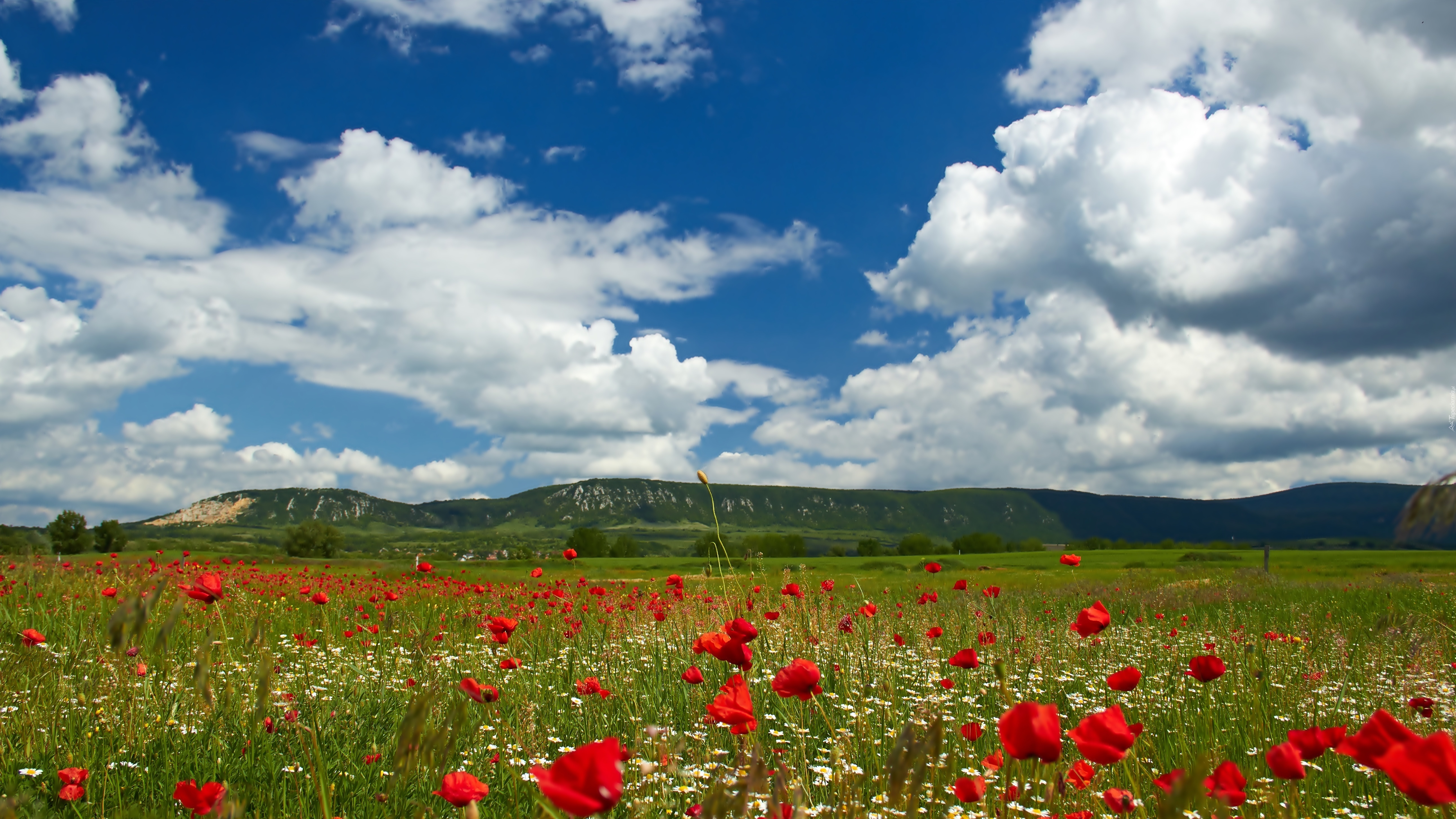 Edytor tapety: Łąka, Trawa, Maki, Rumianki, Góry, Niebo, Chmury