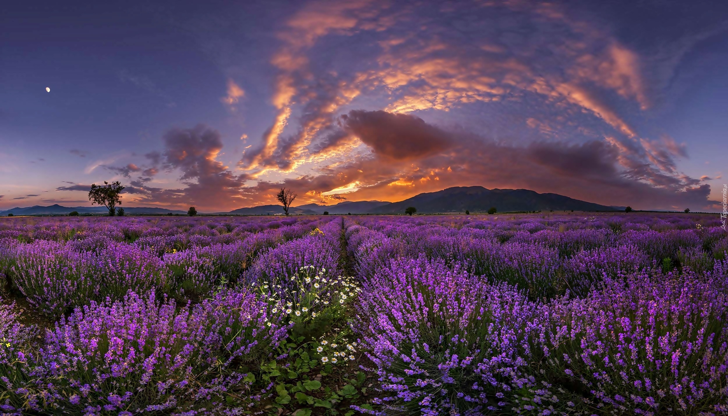 Edytor tapety: Lawendowe, Pole, Zachód, Słońca, Obłoki