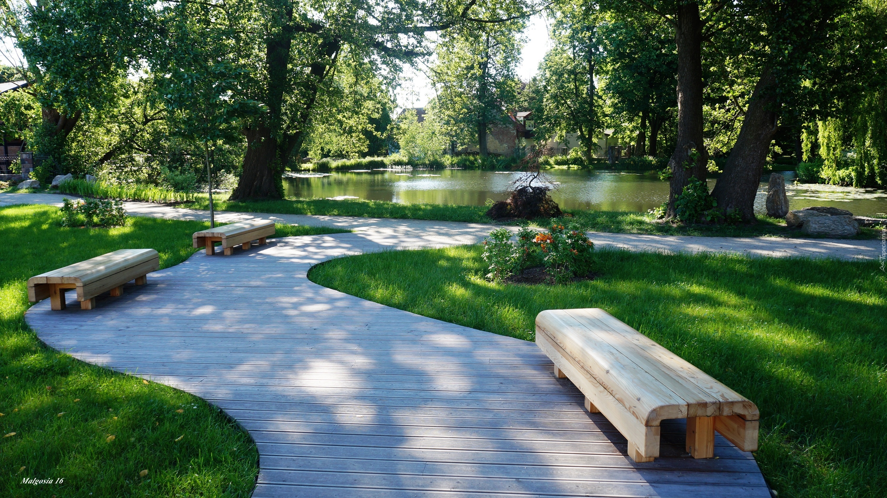 Edytor tapety: Park, Ścieżka, Ławeczki, Drzewa, Jeziorko, Zieleń