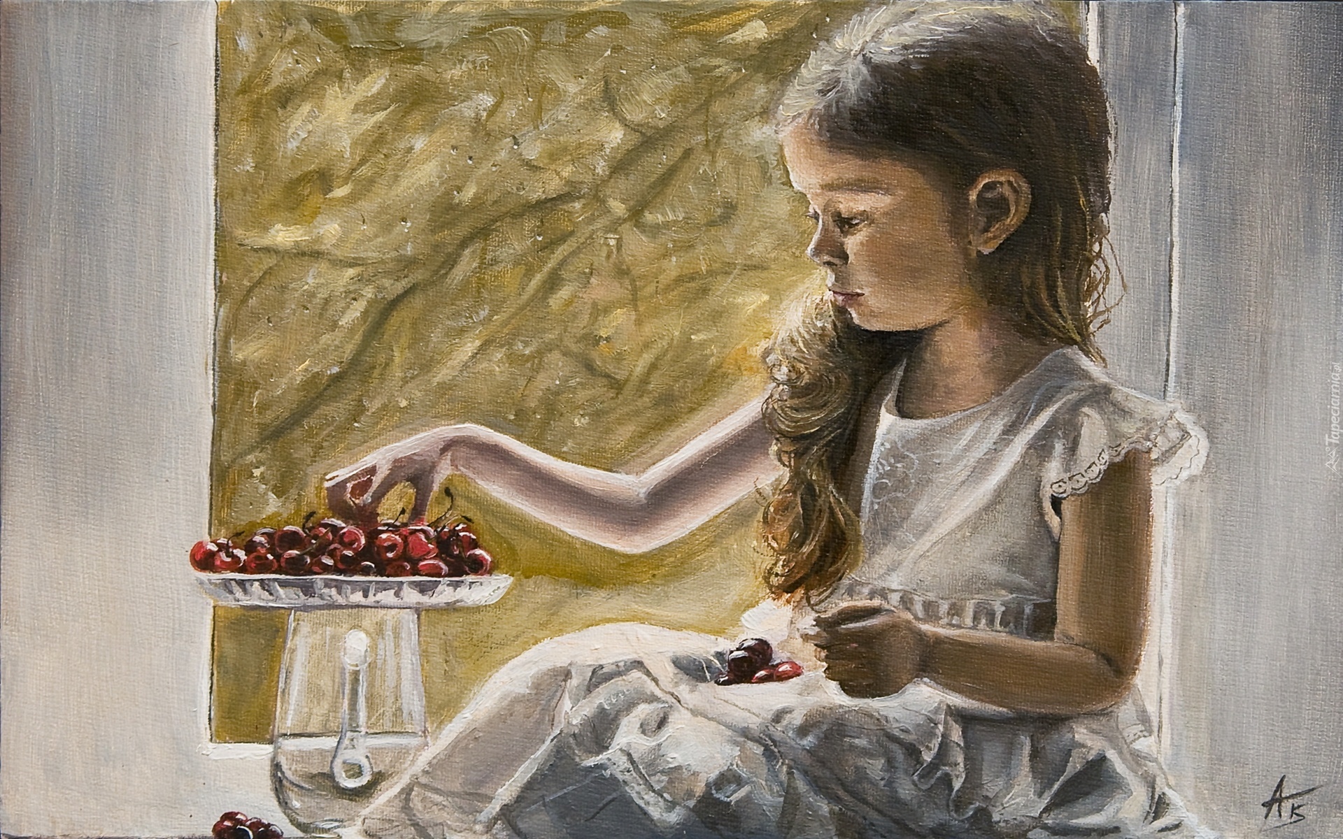Edytor tapety: Malarstwo, Obraz, Dziewczynka, Czereśnie, Okno