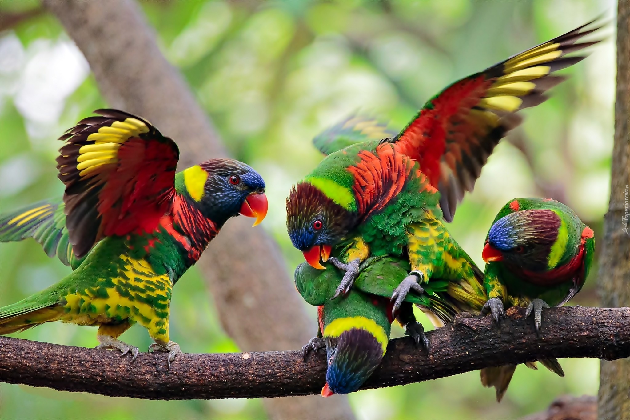 Edytor tapety: Lorysy Górskie, Kolorowe, Ptaki, Gałąź