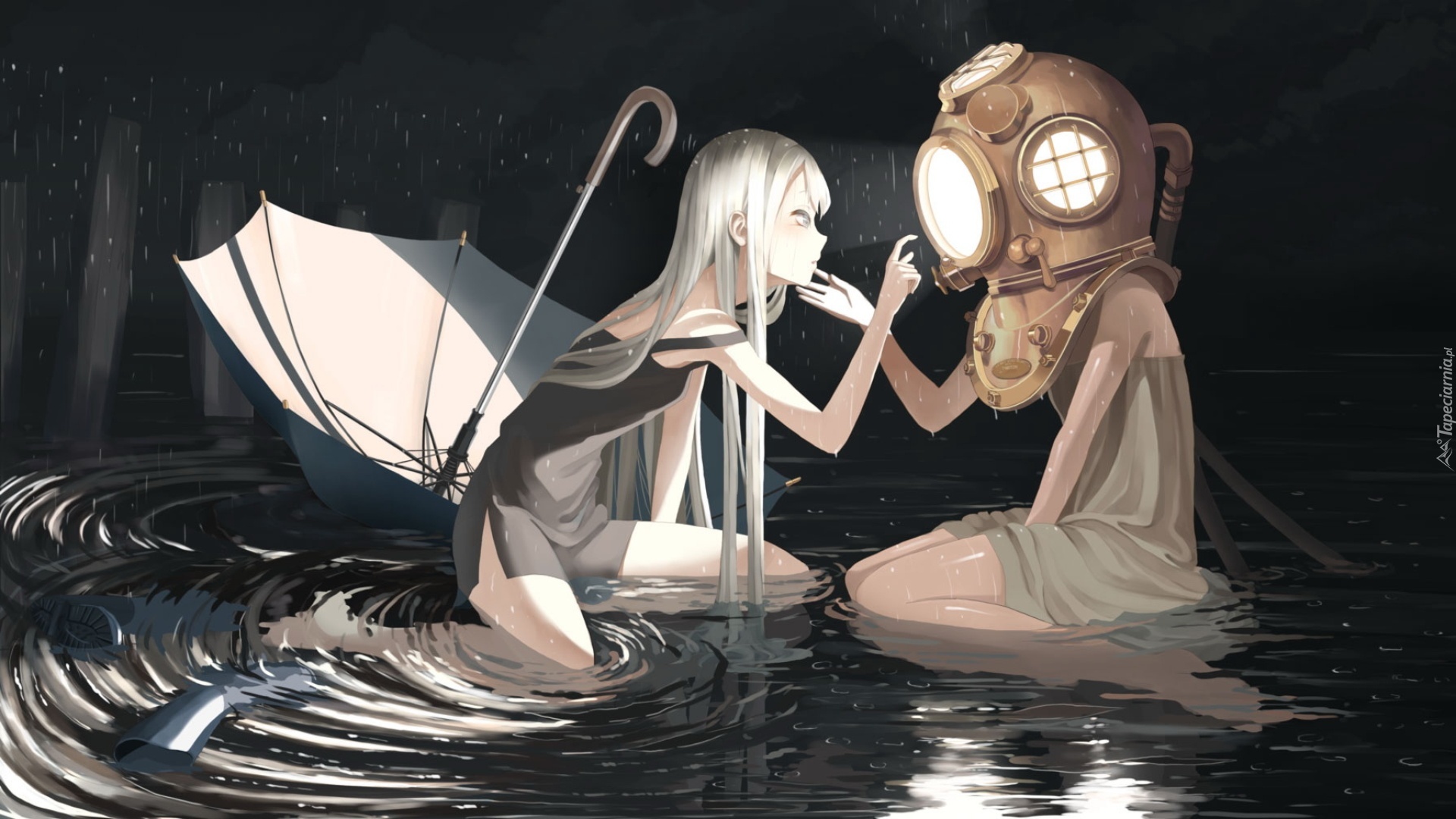 Edytor tapety: Dziewczyny, Parasol, Deszcz, Woda, Kalosze, Hełm
