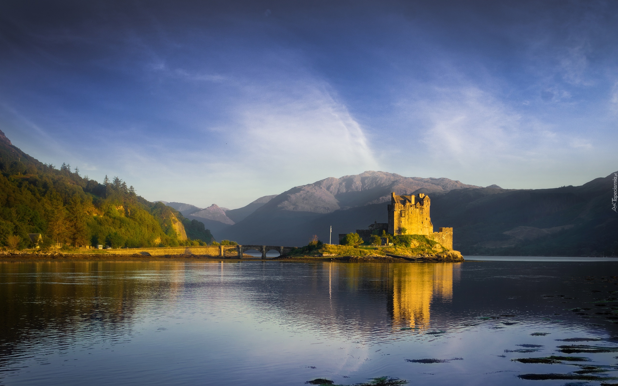 Edytor tapety: Szkocja, Jezioro, Most, Wyspa, Zamek, Góry, Drzewa