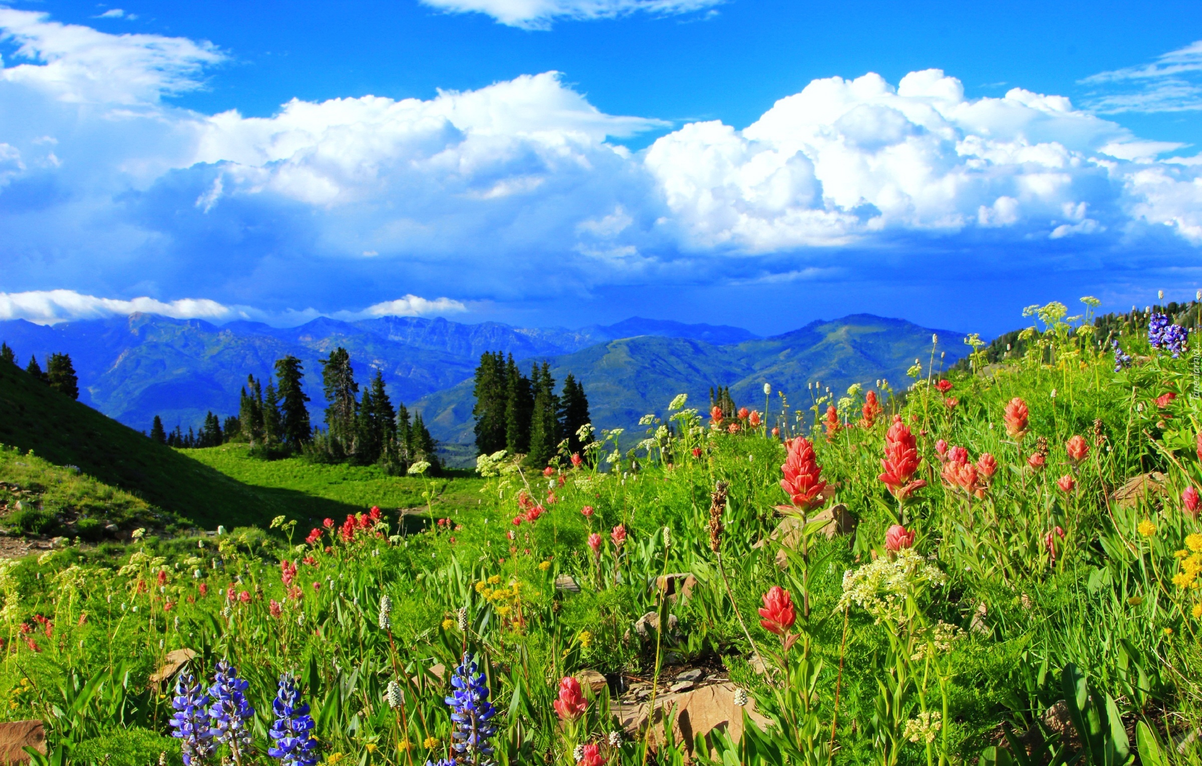 Edytor tapety: Góry, Lasy, Łąka, Górskie, Kwiatuszki, Chmury