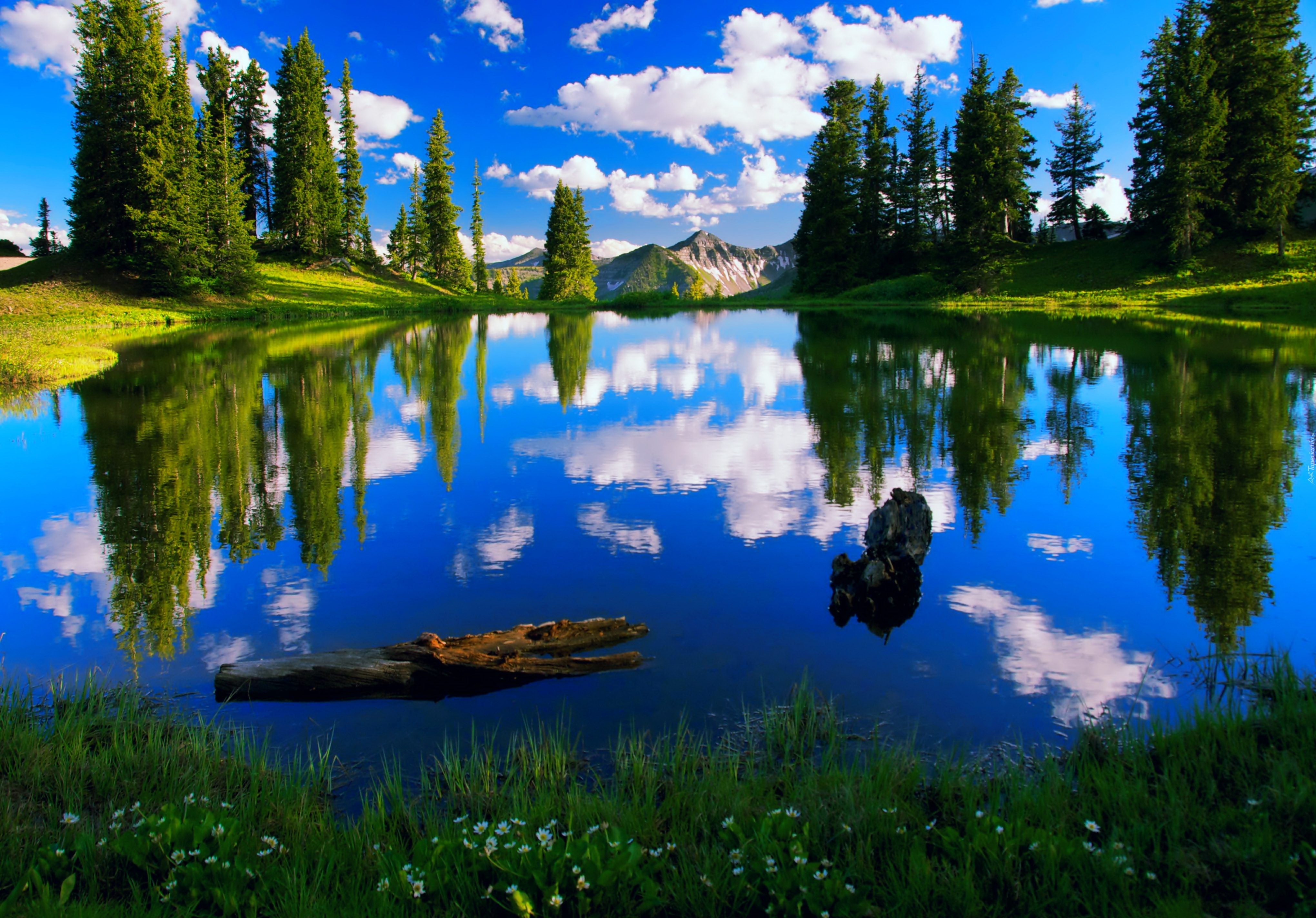 Edytor tapety: Niebieskie, Jezioro, Góry, Drzewa, Kwiatuszki
