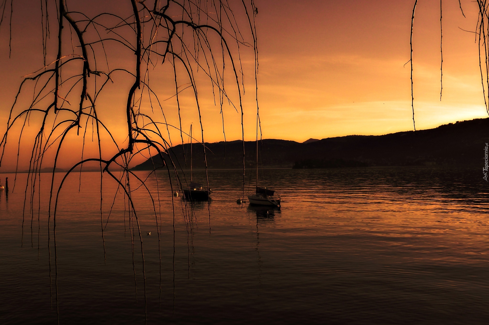 Edytor tapety: Jezioro, Zachód słońca, Łodzie