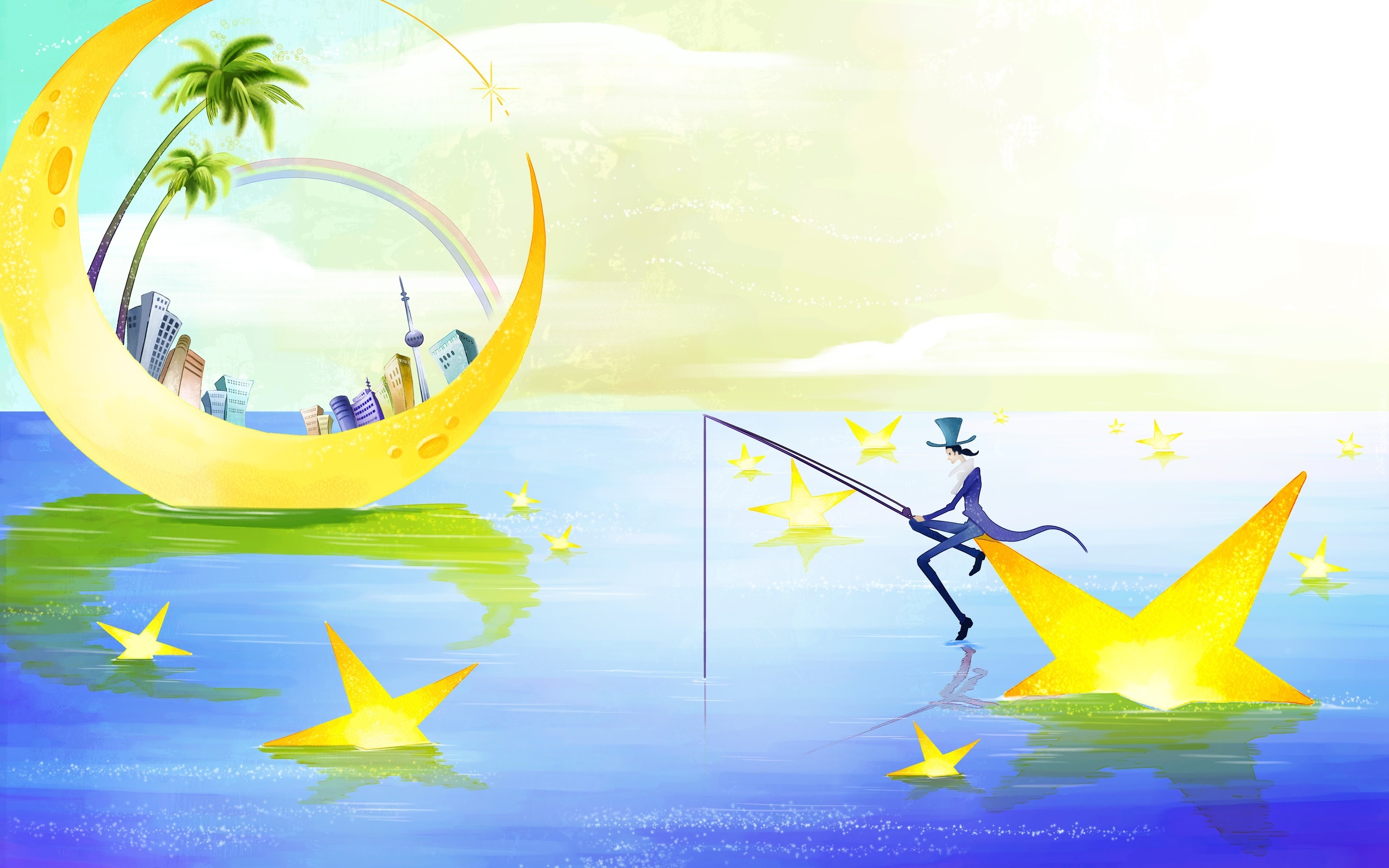 Edytor tapety: Palmny, Miasto, Gwiazdy, Księżyc, Woda