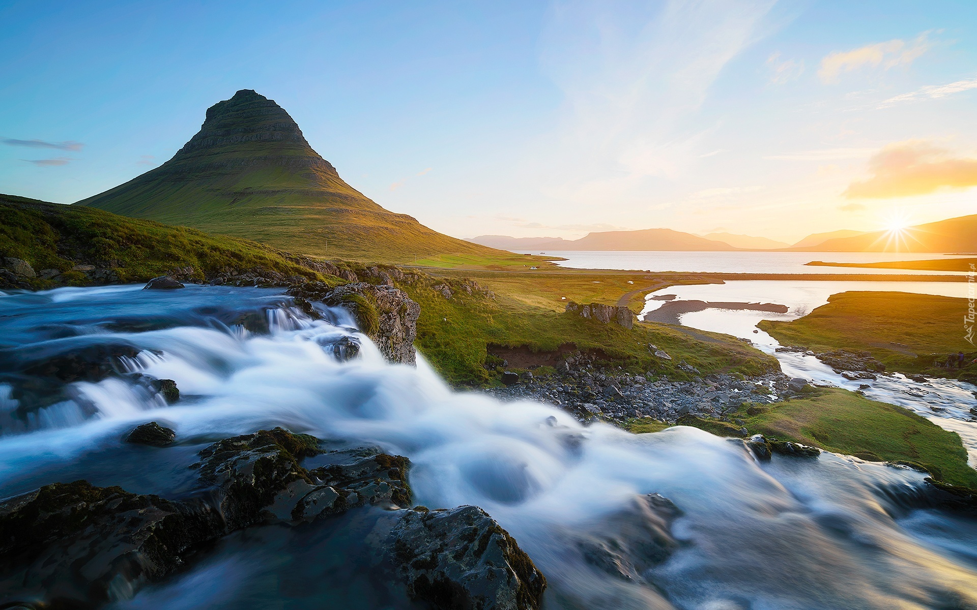 Edytor tapety: Islandia, Góra Kirkjufell, Wodospad Kirkjufellsfoss, Rzeka, Kamienie, Wschód słońca