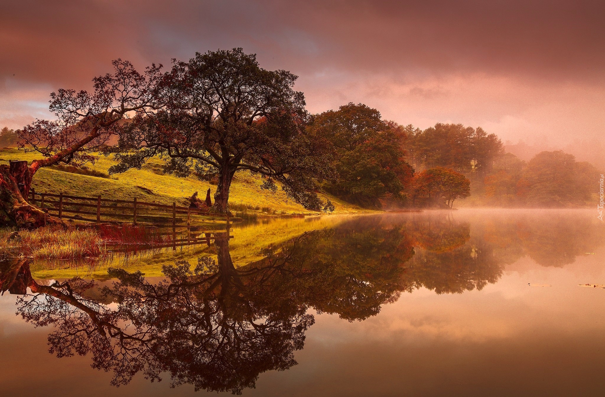 Edytor tapety: Jezioro, Drzewa, Mgła, Odbicie