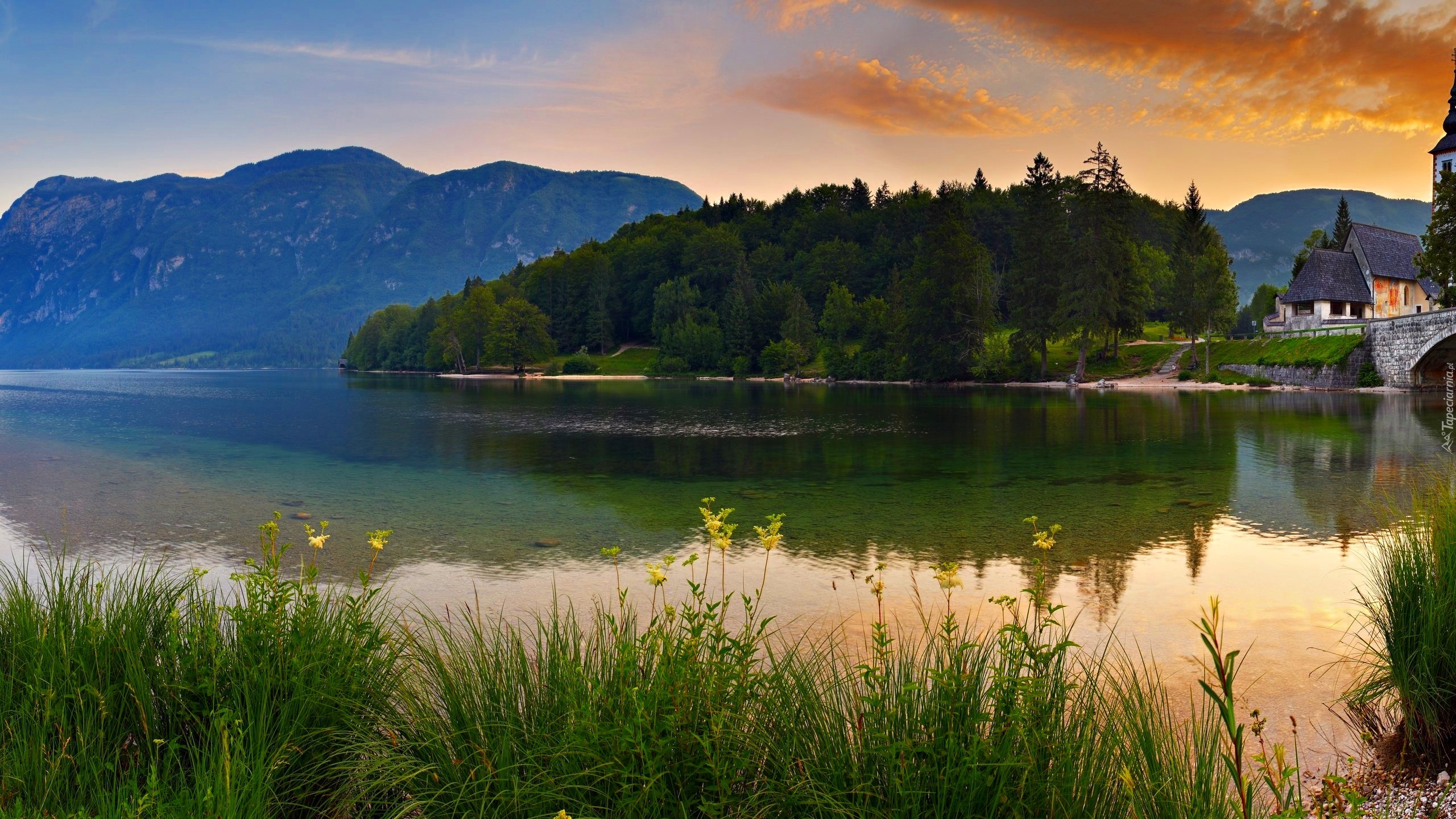 Edytor tapety: Rzeka, Góry, Las, Dom, Zachód słońca