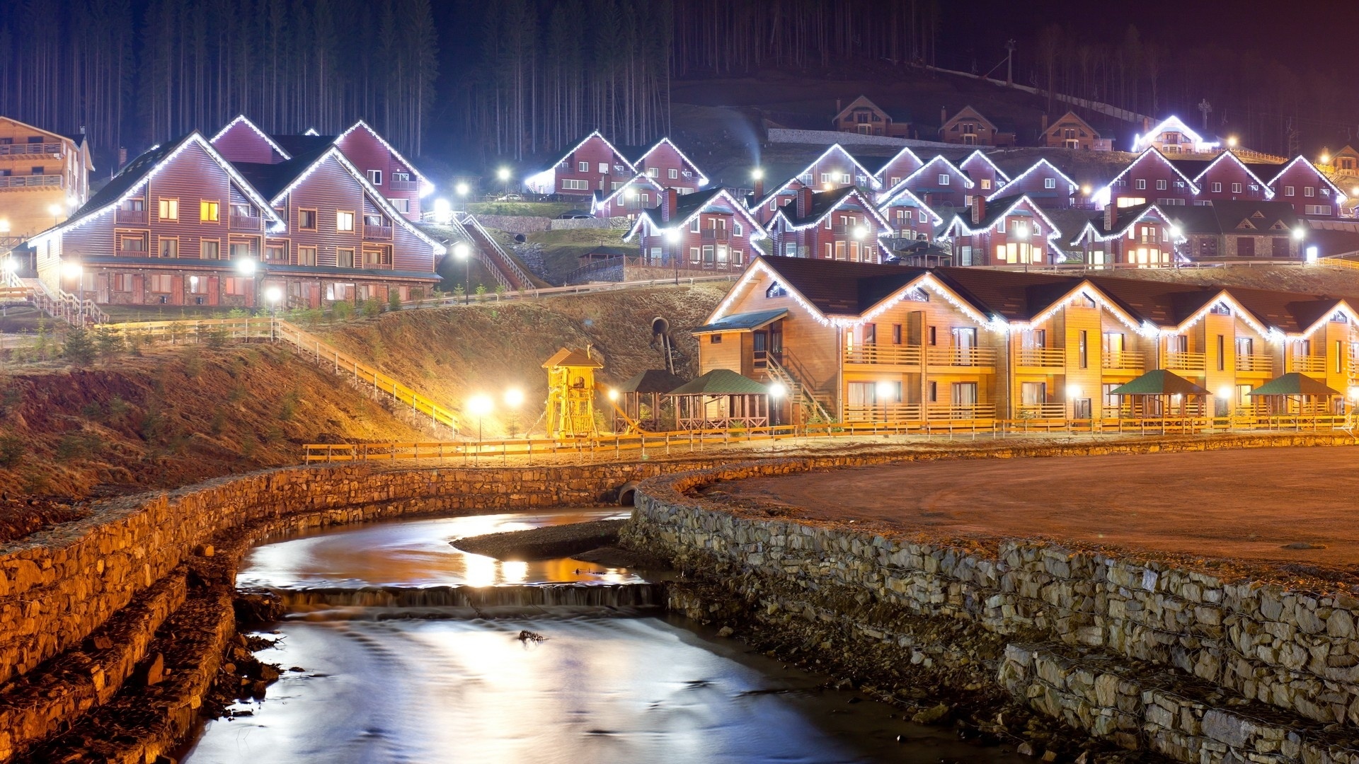 Edytor tapety: Domy, Noc, Rzeka
