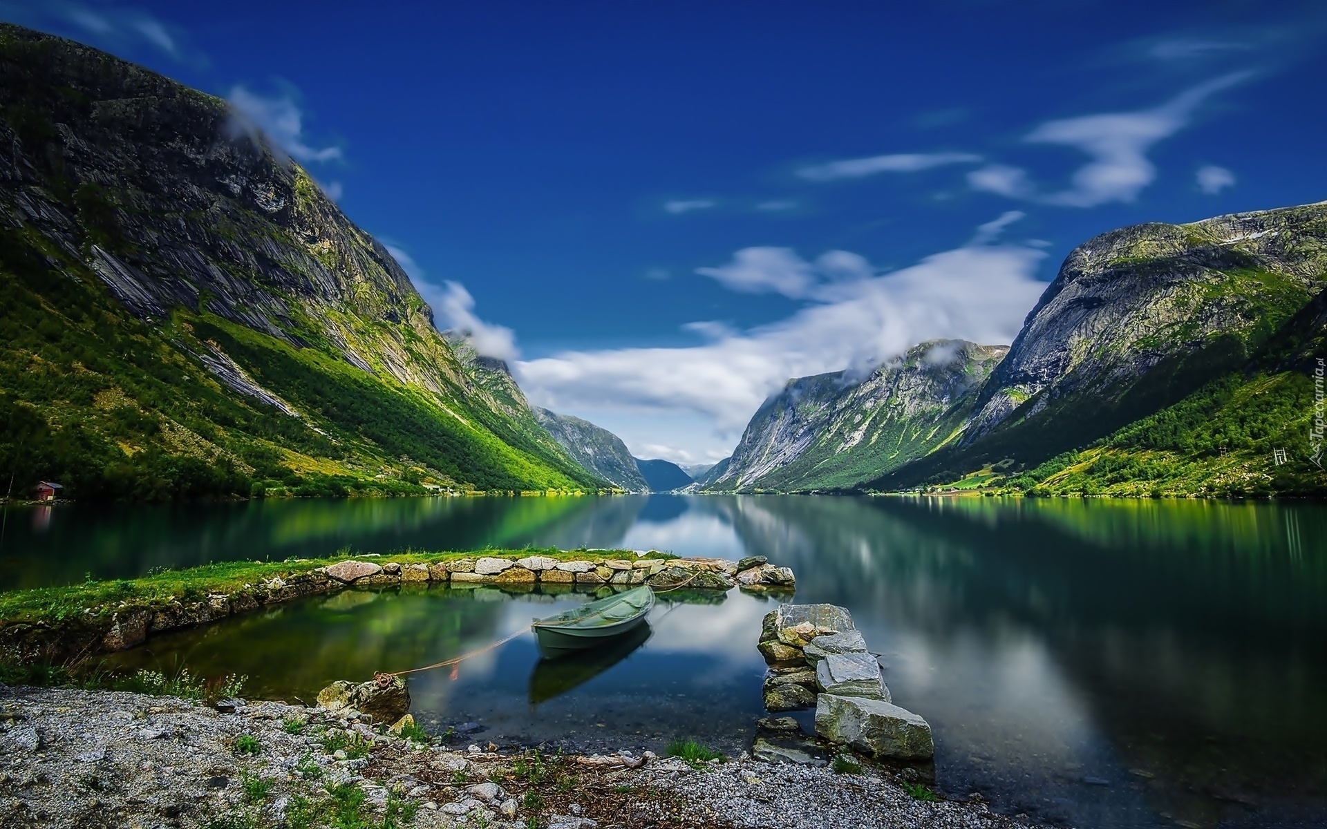 Edytor tapety: Norwegia, Góry, Fiord, Łódka, Kamienie