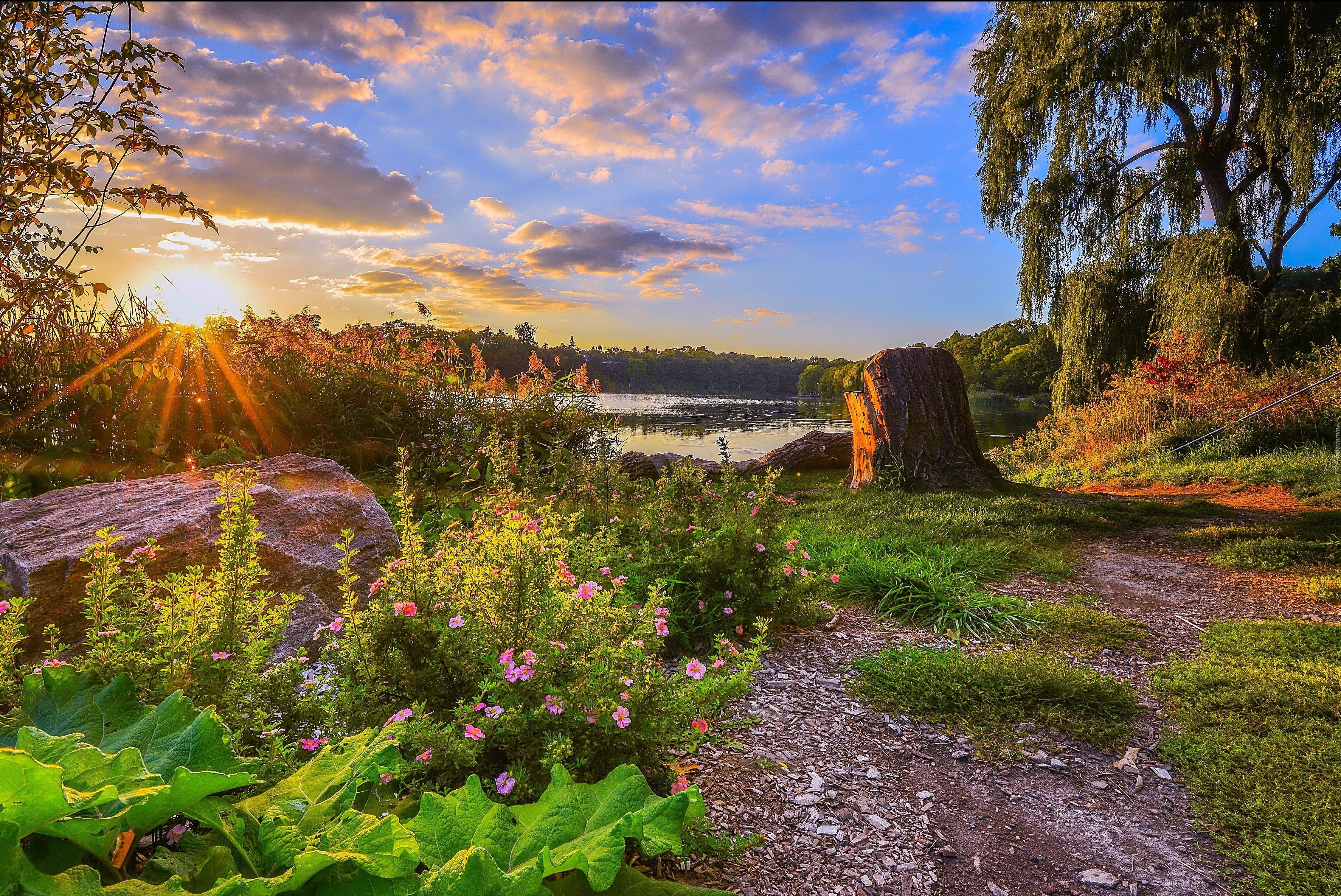 Edytor tapety: Jezioro, Wschód słońca, Kwiaty, Roślinność, Drzewa