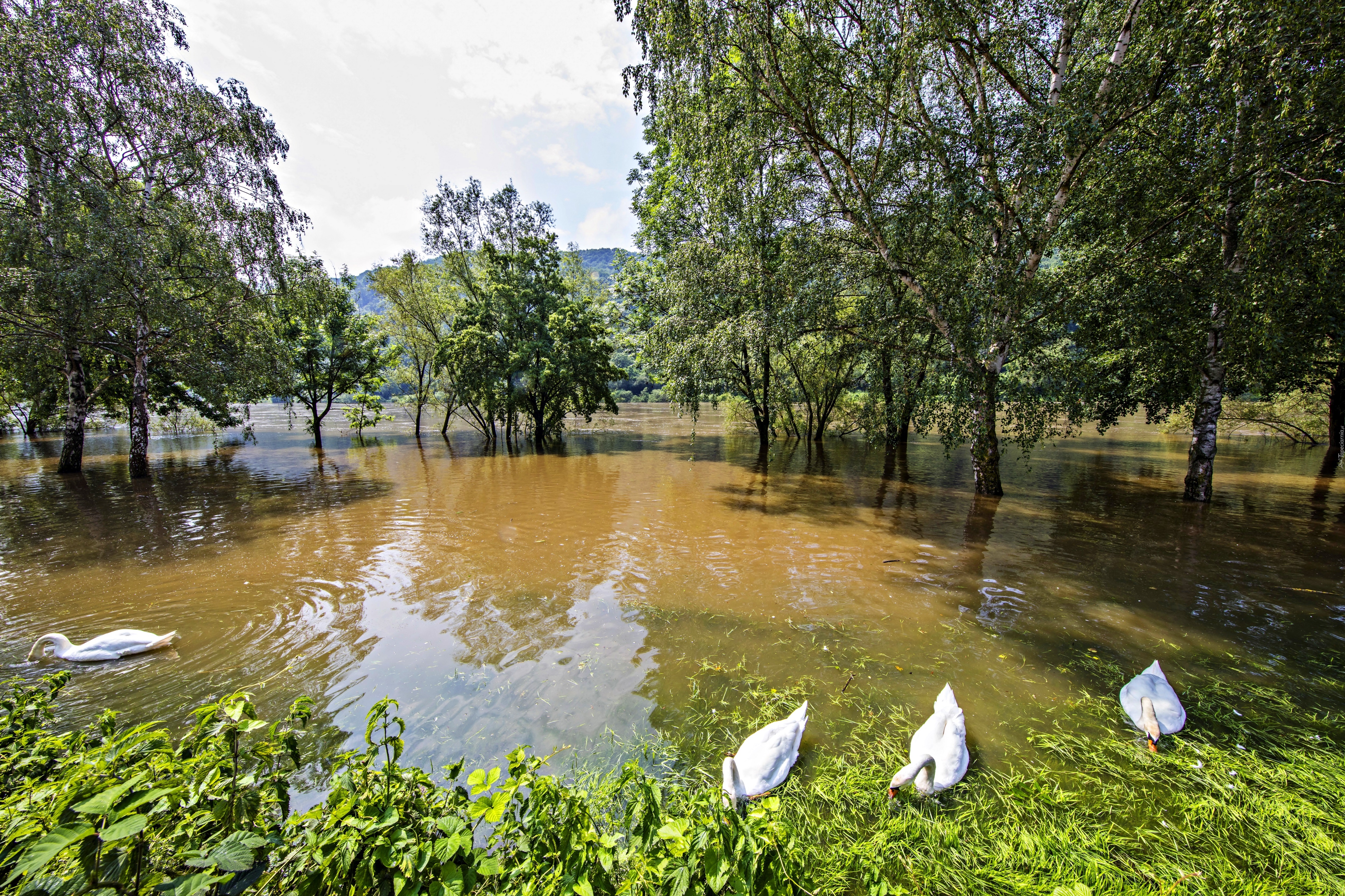 Edytor tapety: Rzeka, Zalane, Drzewa, Łabędzie