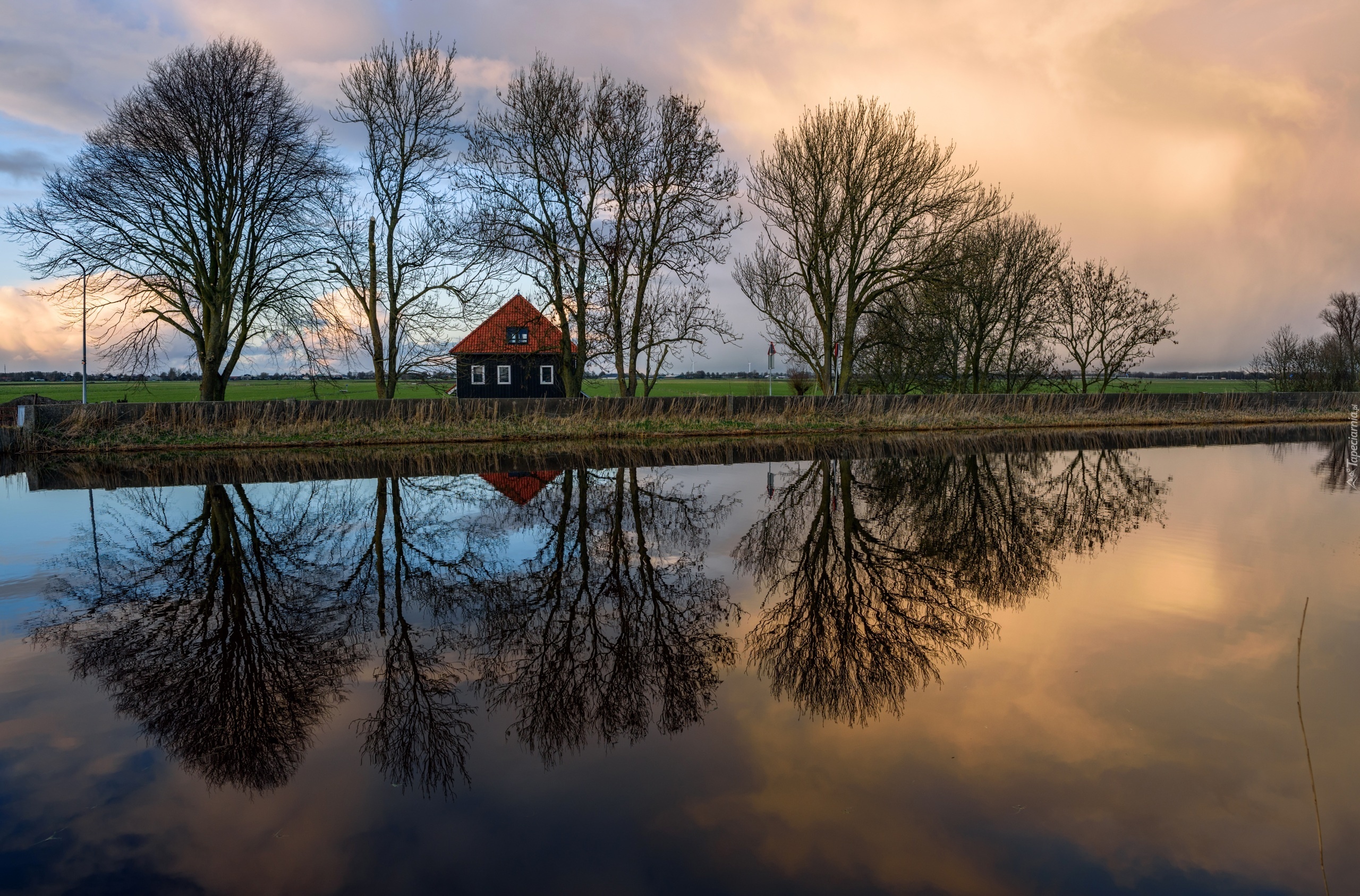 Edytor tapety: Holandia, Dom, Rzeka, Bezlistne, Drzewa, Odbicie