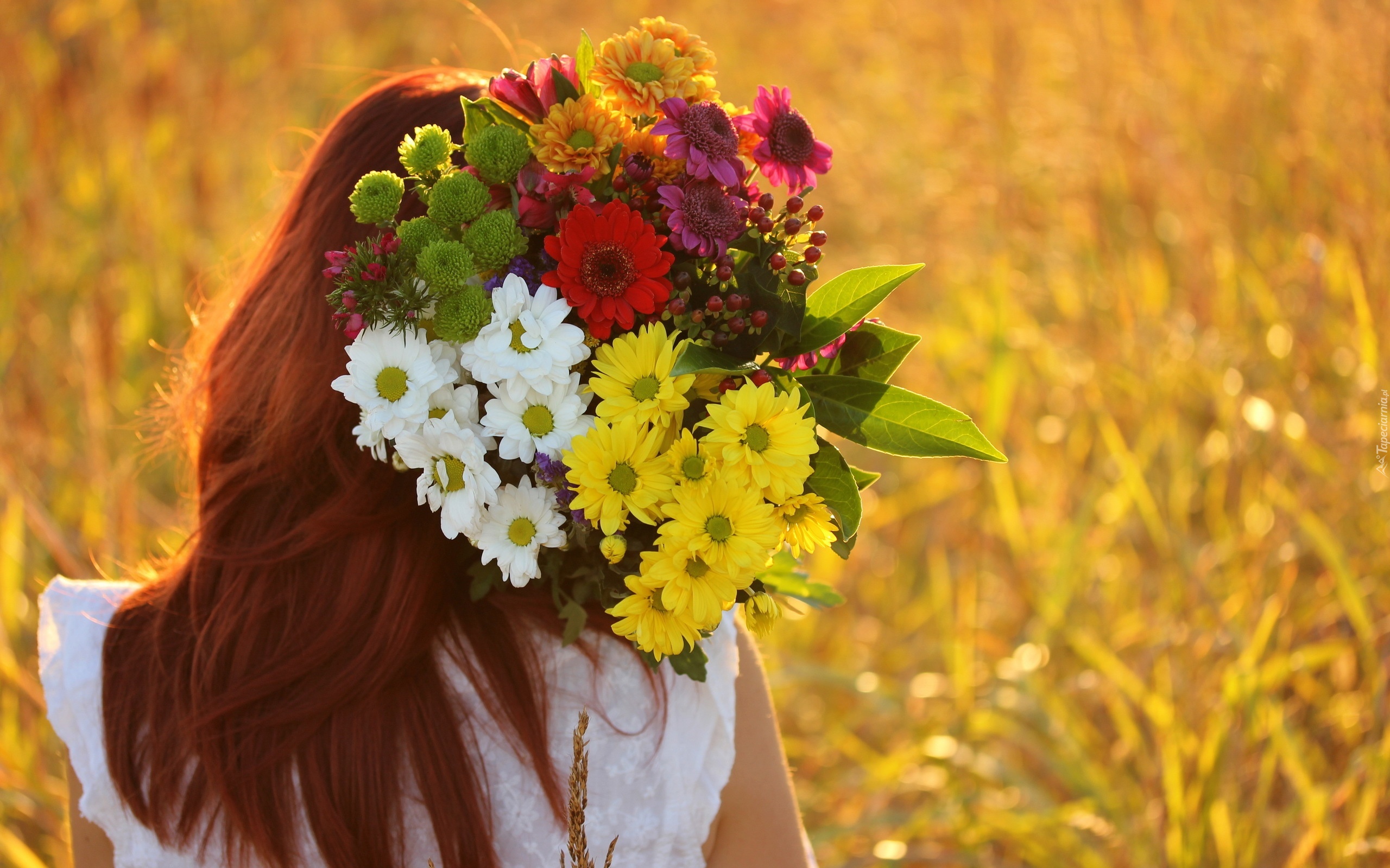 Edytor tapety: Lato, Rudowłosa, Kobieta, Bukiet, Kolorowych, Kwiatów, Rozmyte