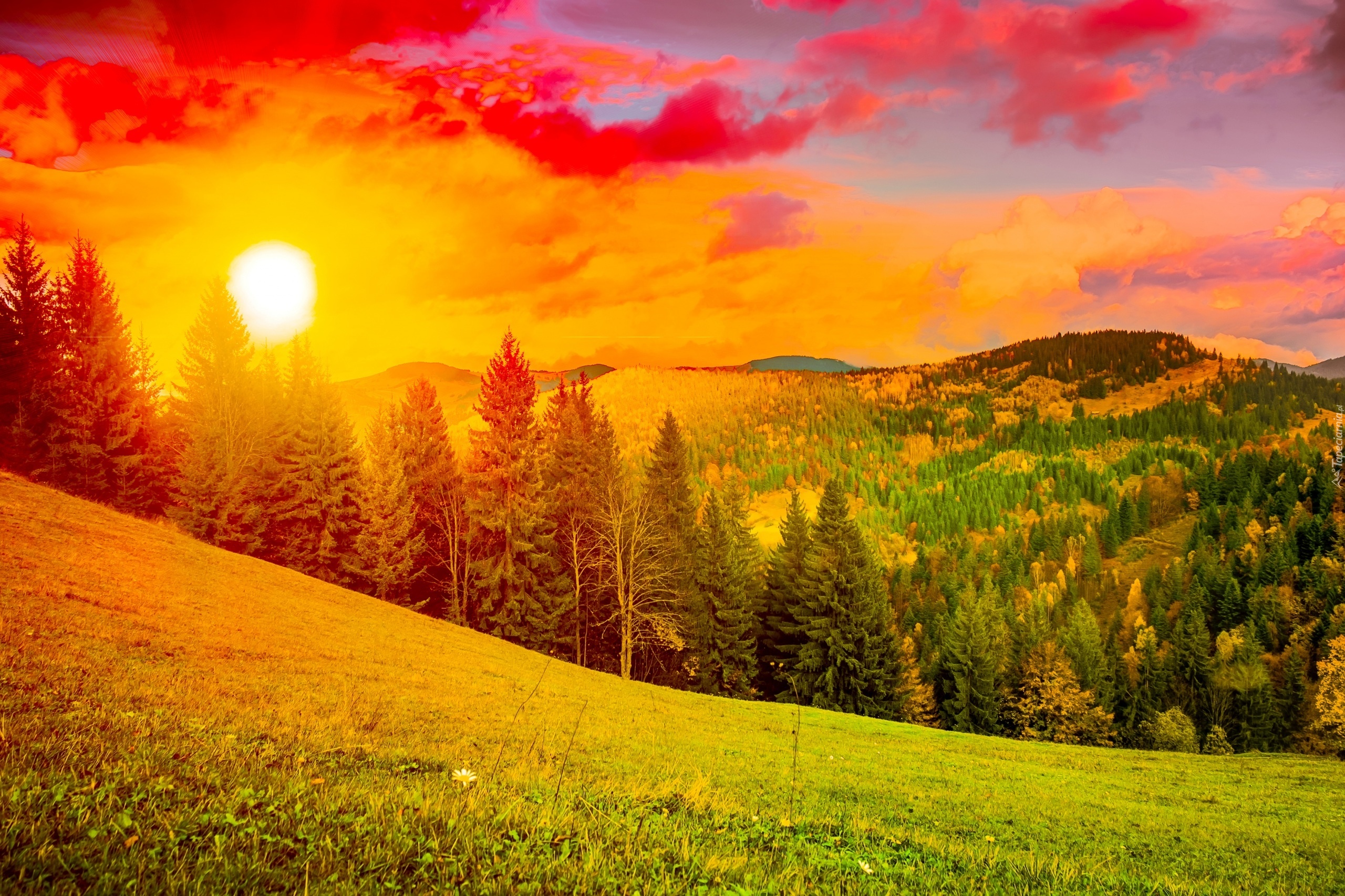 Edytor tapety: Zachód, Słońce, Drzewa, Pomarańczowy, Kolor