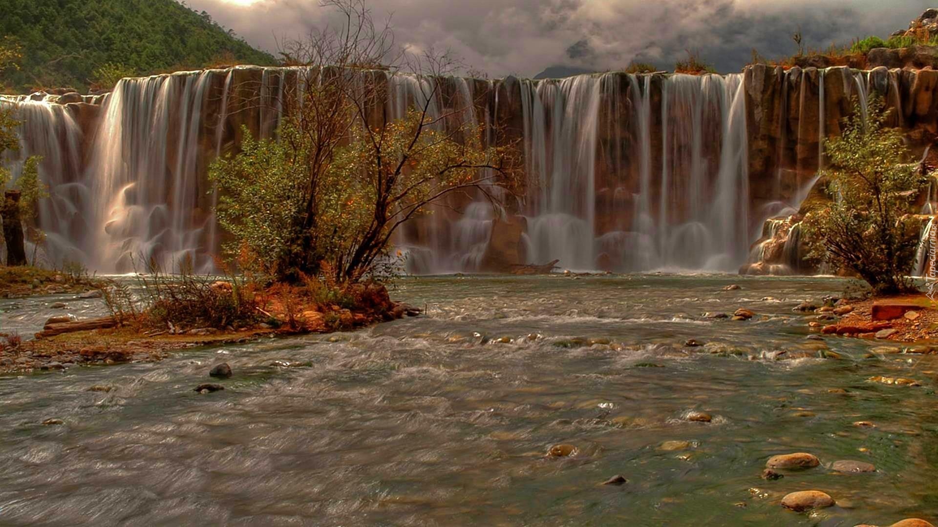 Edytor tapety: Wodospad, Rzeka, Kamienie, Drzewa