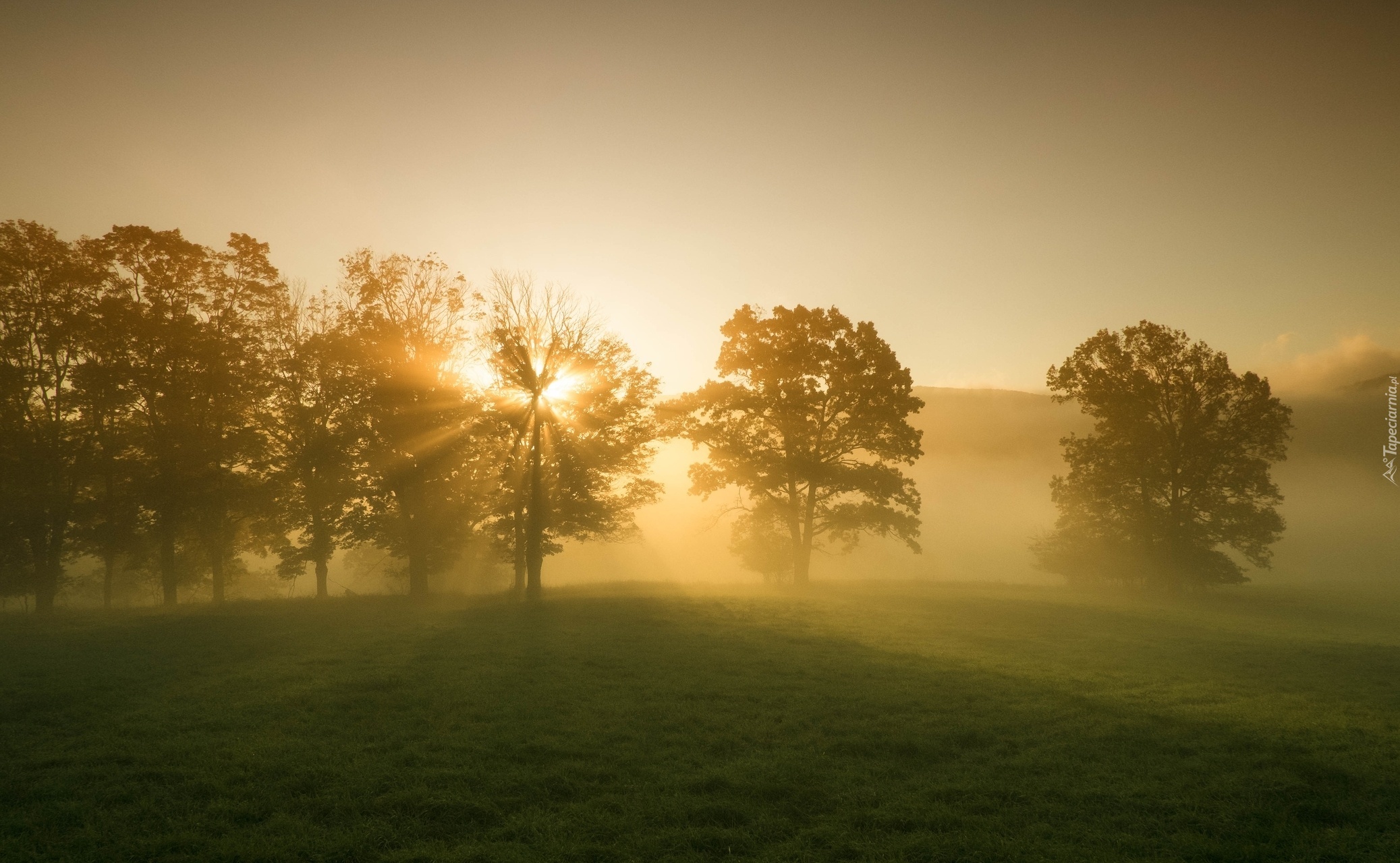 Edytor tapety: Łąka, Drzewa, Wschód, Słońca, Przebijające, Światło