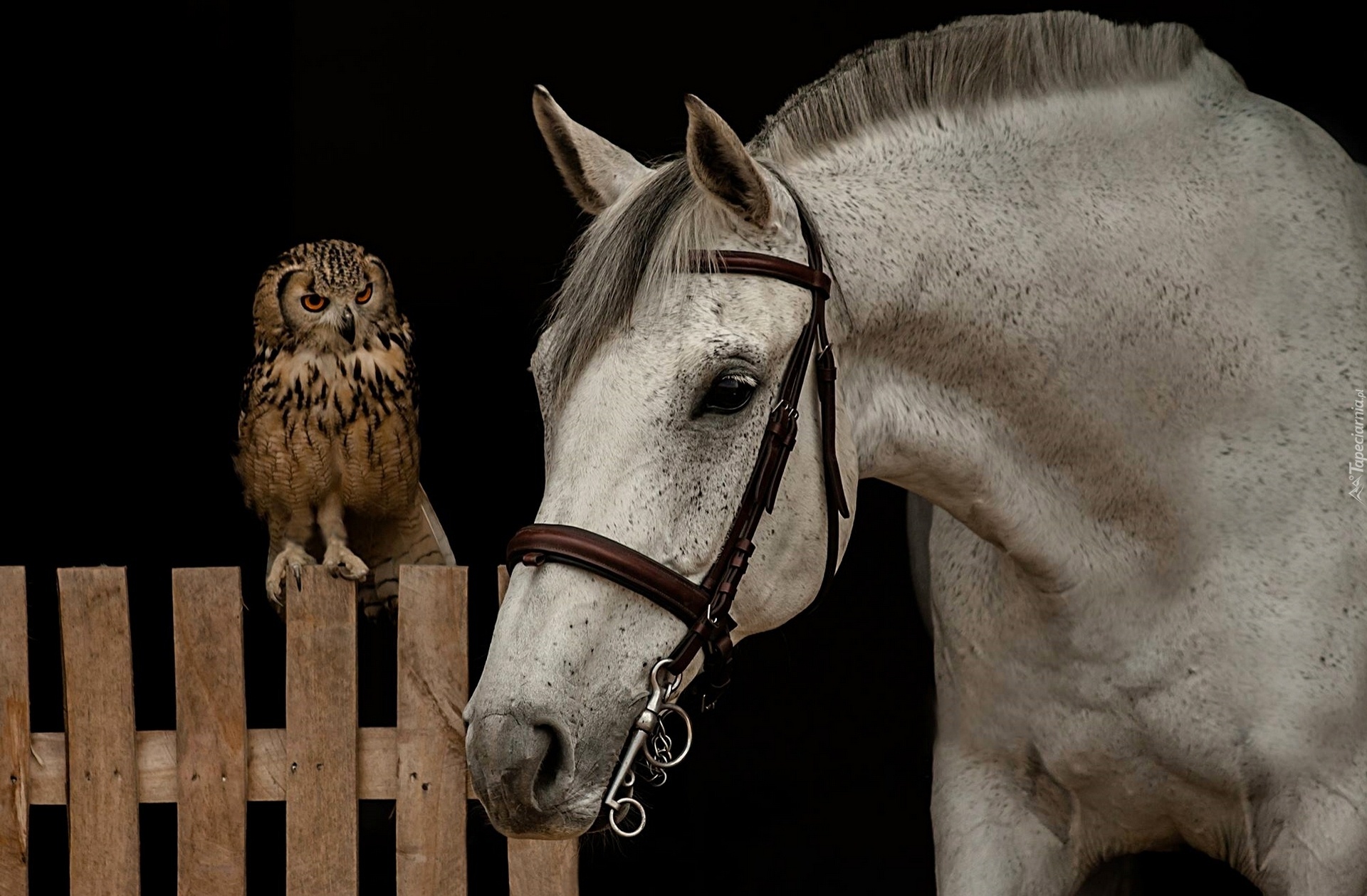 Edytor tapety: Siwy, Koń, Sowa, Drewniany, Płot