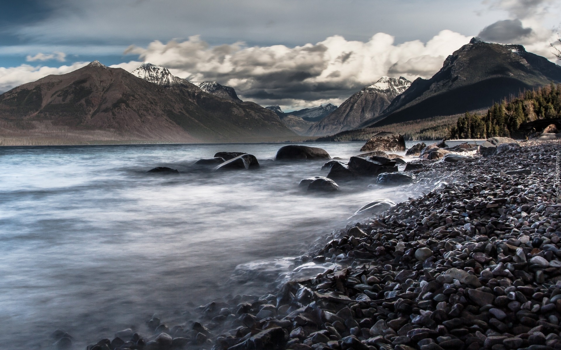 Edytor tapety: Jezioro, Góry, Kamienie, Chmury