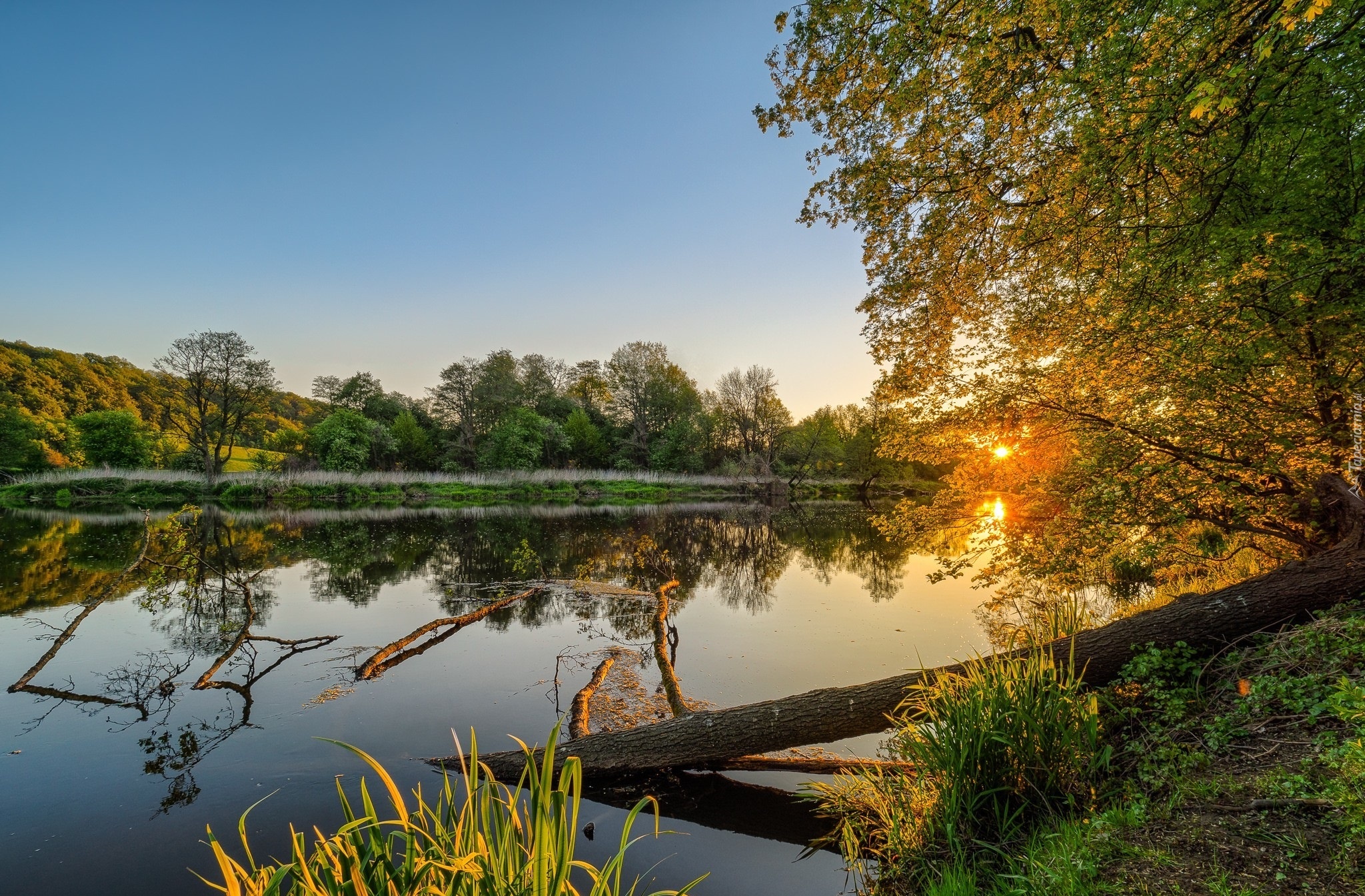 Edytor tapety: Rzeka, Drzewa, Zachód, Słońca