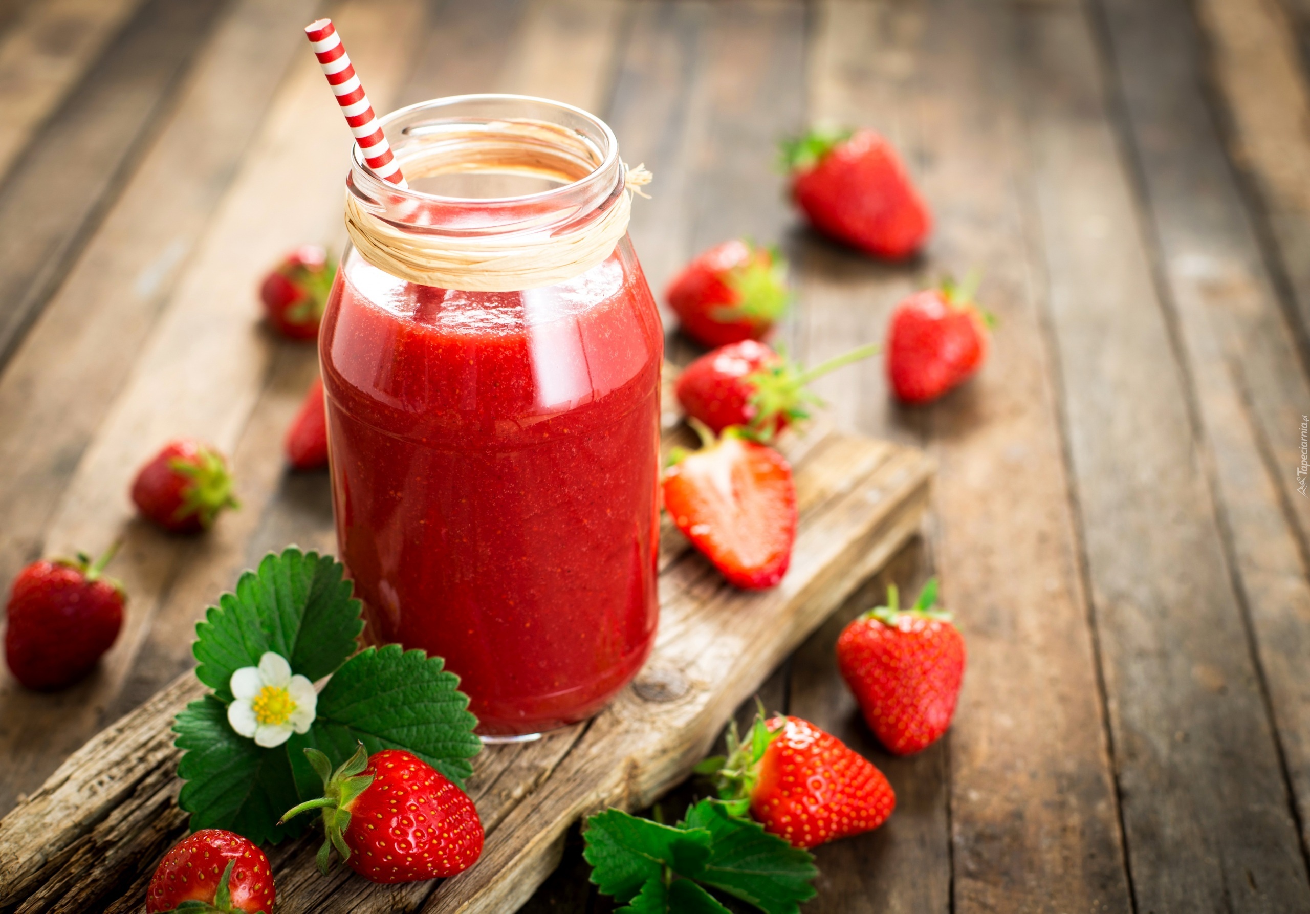 Edytor tapety: Truskawki, Mus, Kwiat, Liście, Deska