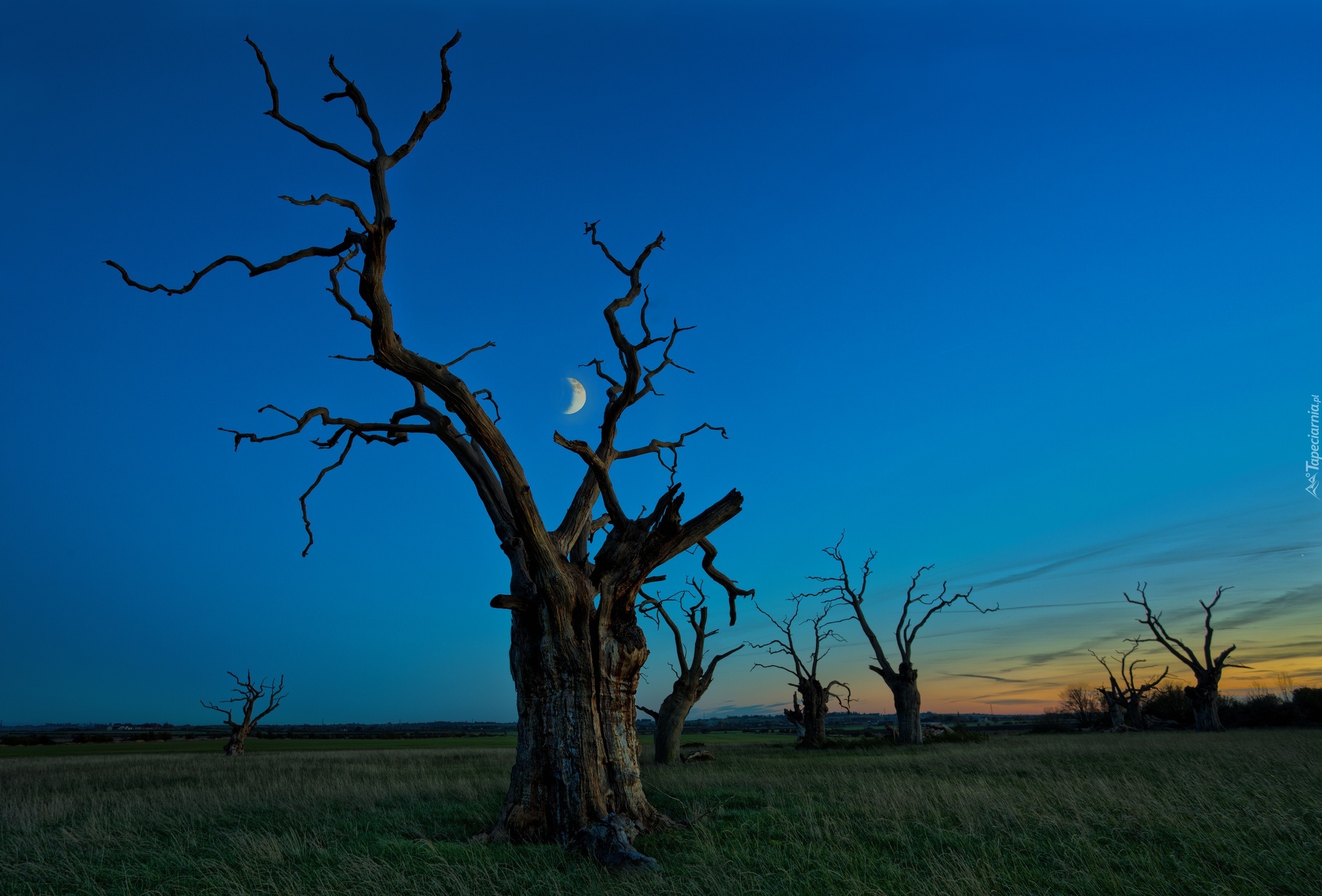 Edytor tapety: Uschnięte, Drzewa, Trawa, Zachód, Słońca, Księżyc