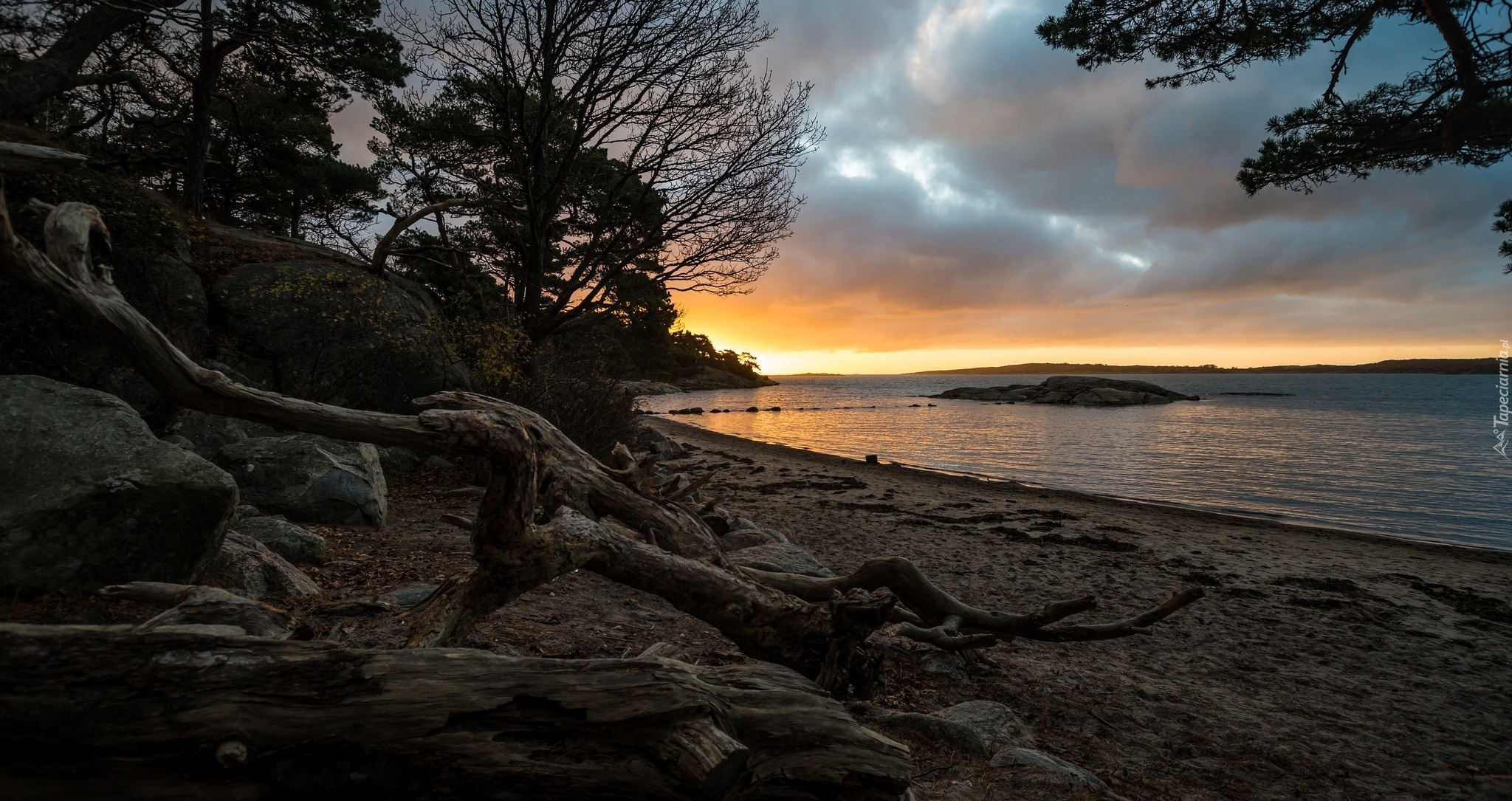 Edytor tapety: Zachód, Słońca, Jezioro, Kamienie, Drzewa