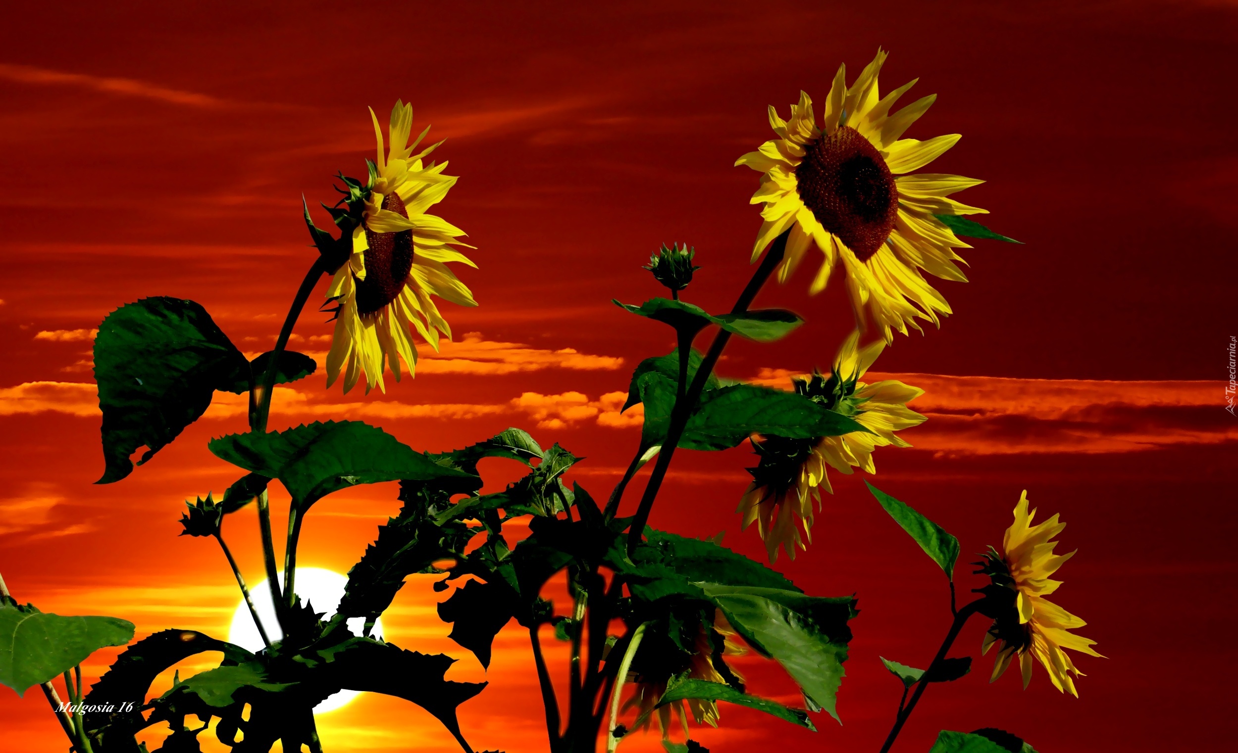 Edytor tapety: Słoneczniki, Zachód Słońca, Czerwone, Niebo