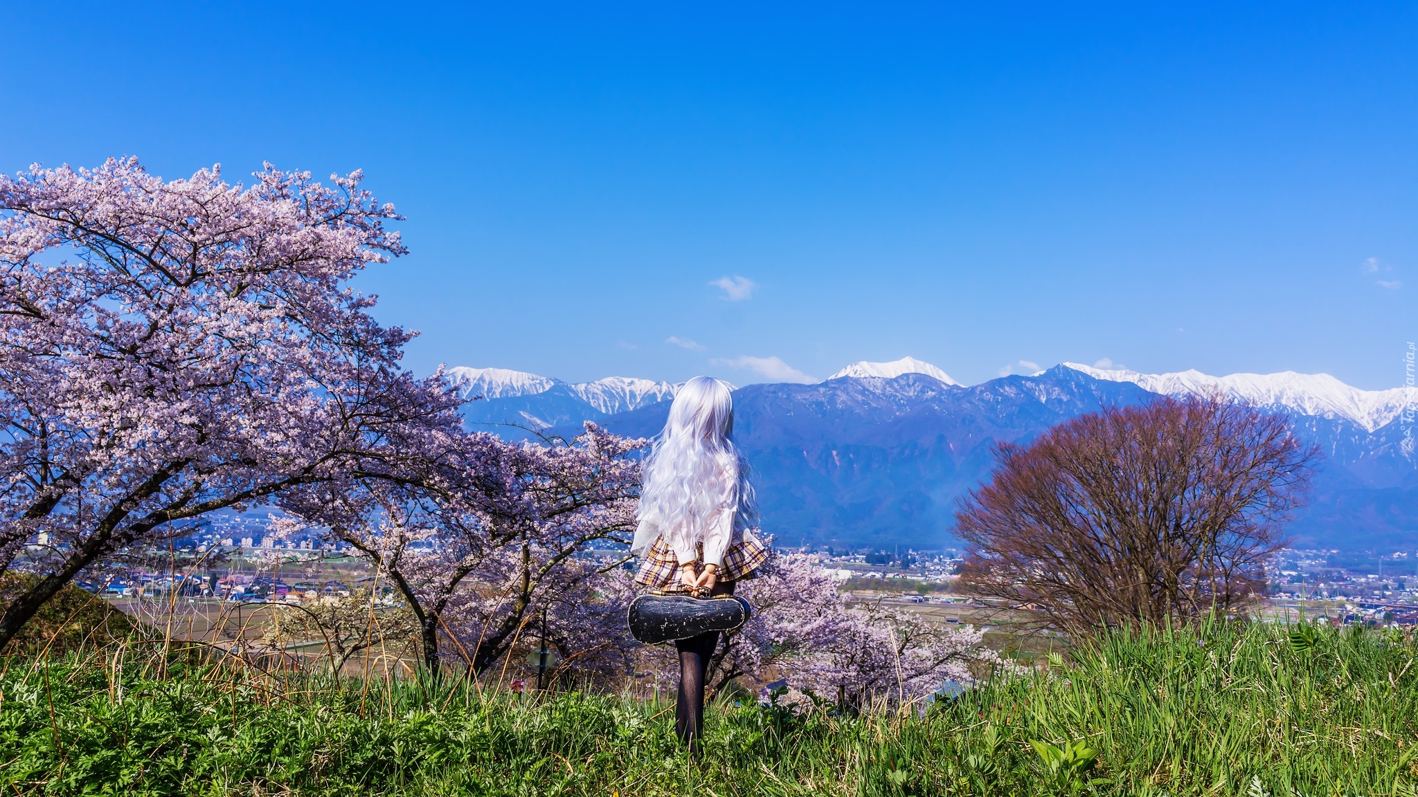Edytor tapety: Góry, Drzewa, Dziewczyna, Trawa