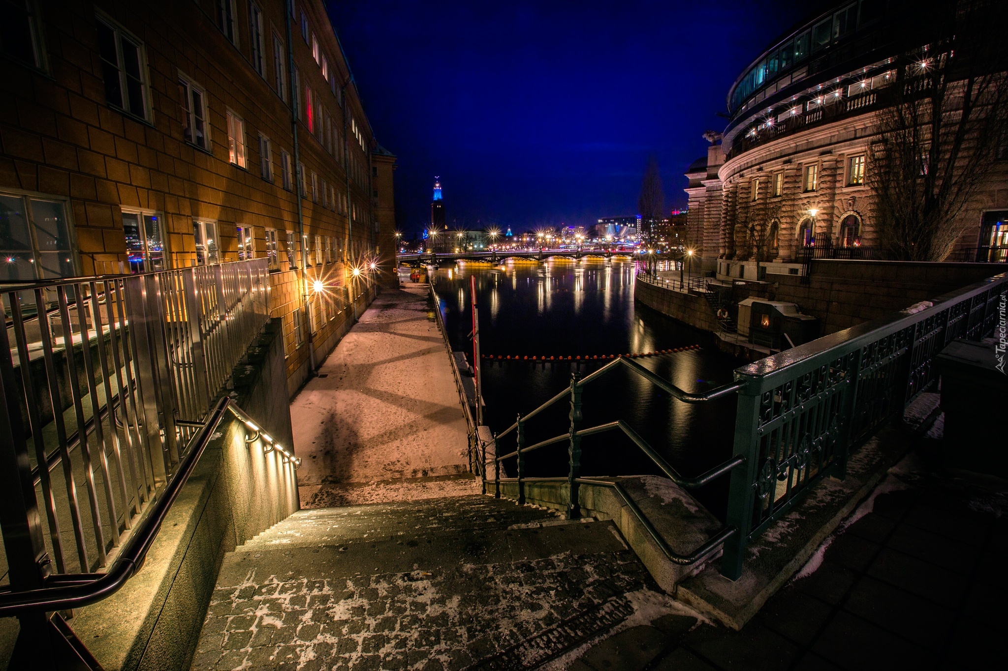 Edytor tapety: Miast nocą, Sztokholm, Szwecja, Rzeka, Schody, Bulwar