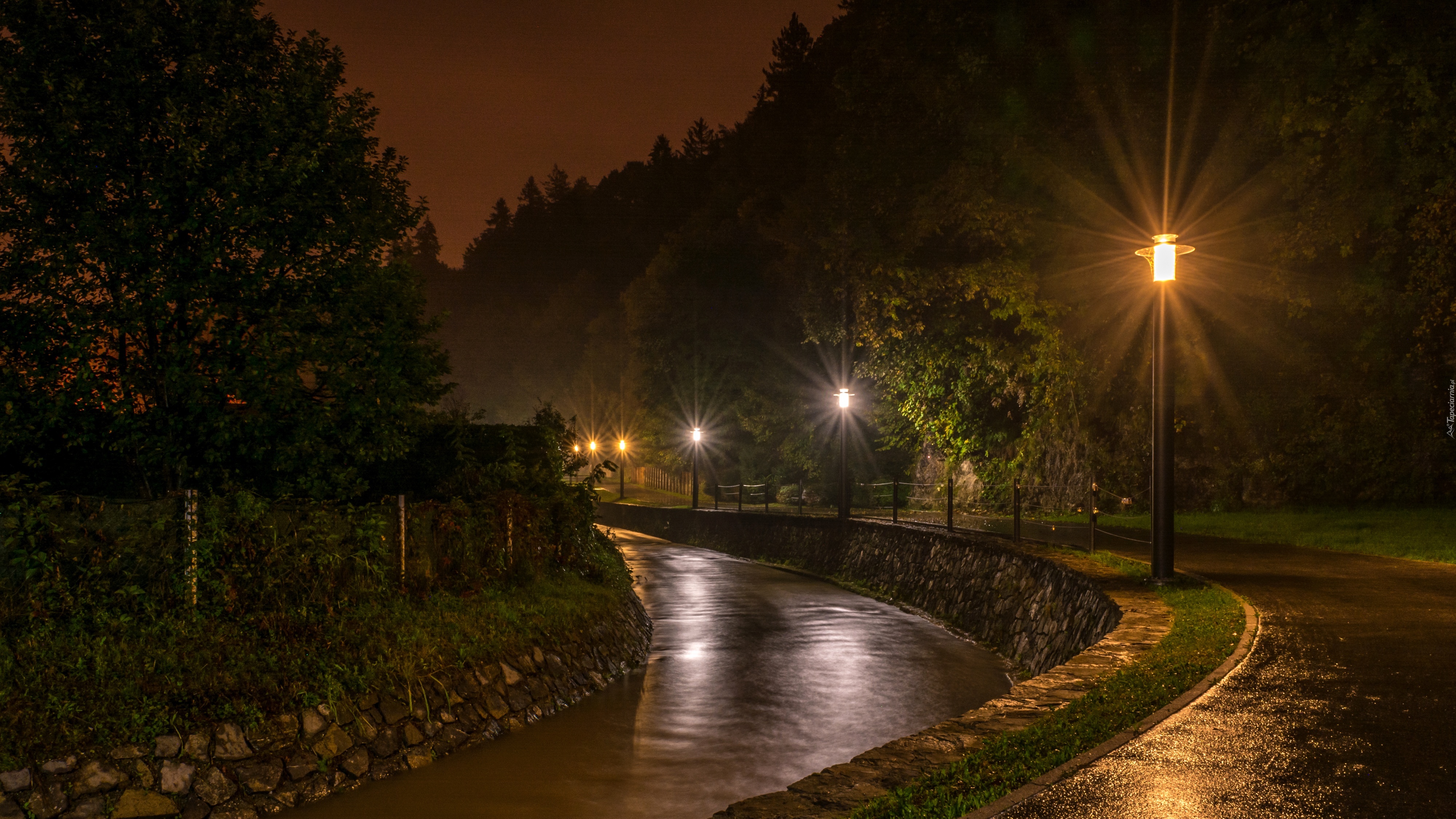 Edytor tapety: Rzeka, Droga, Noc, Latarnie, Drzewa, Światło