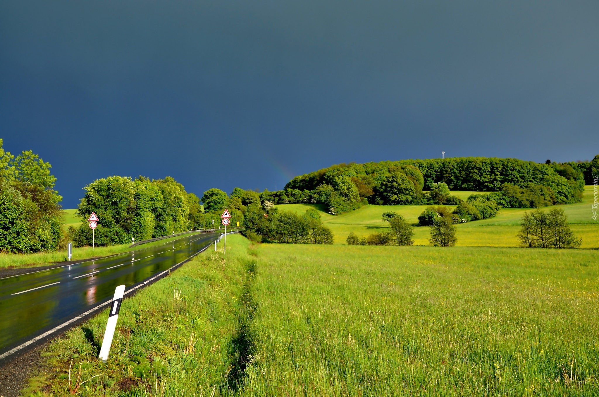Edytor tapety: Mokra, Droga, Pola, Lato