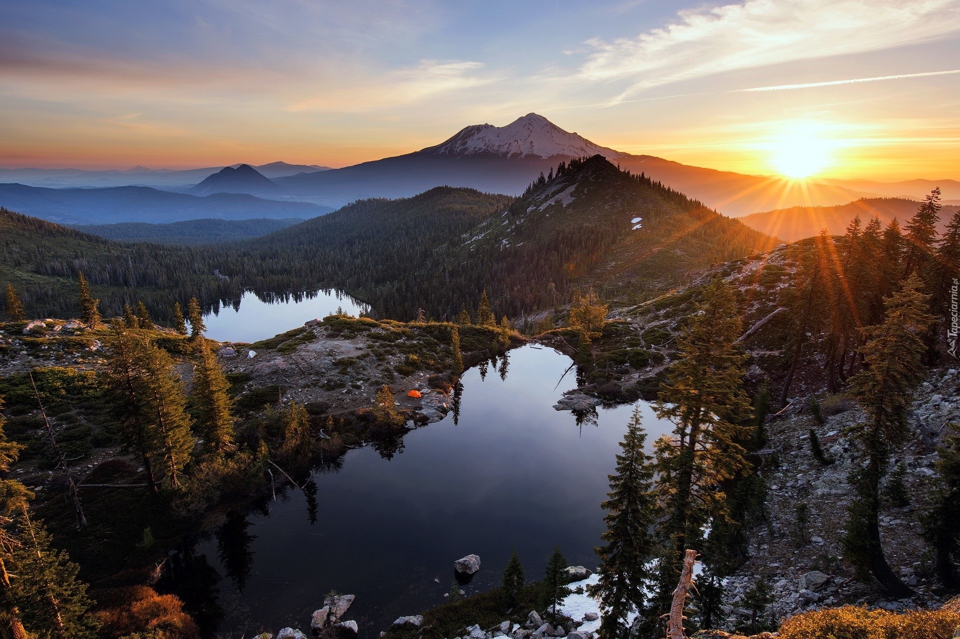 Edytor tapety: Jezioro, Góry, Drzewa, Zachód, Słońca