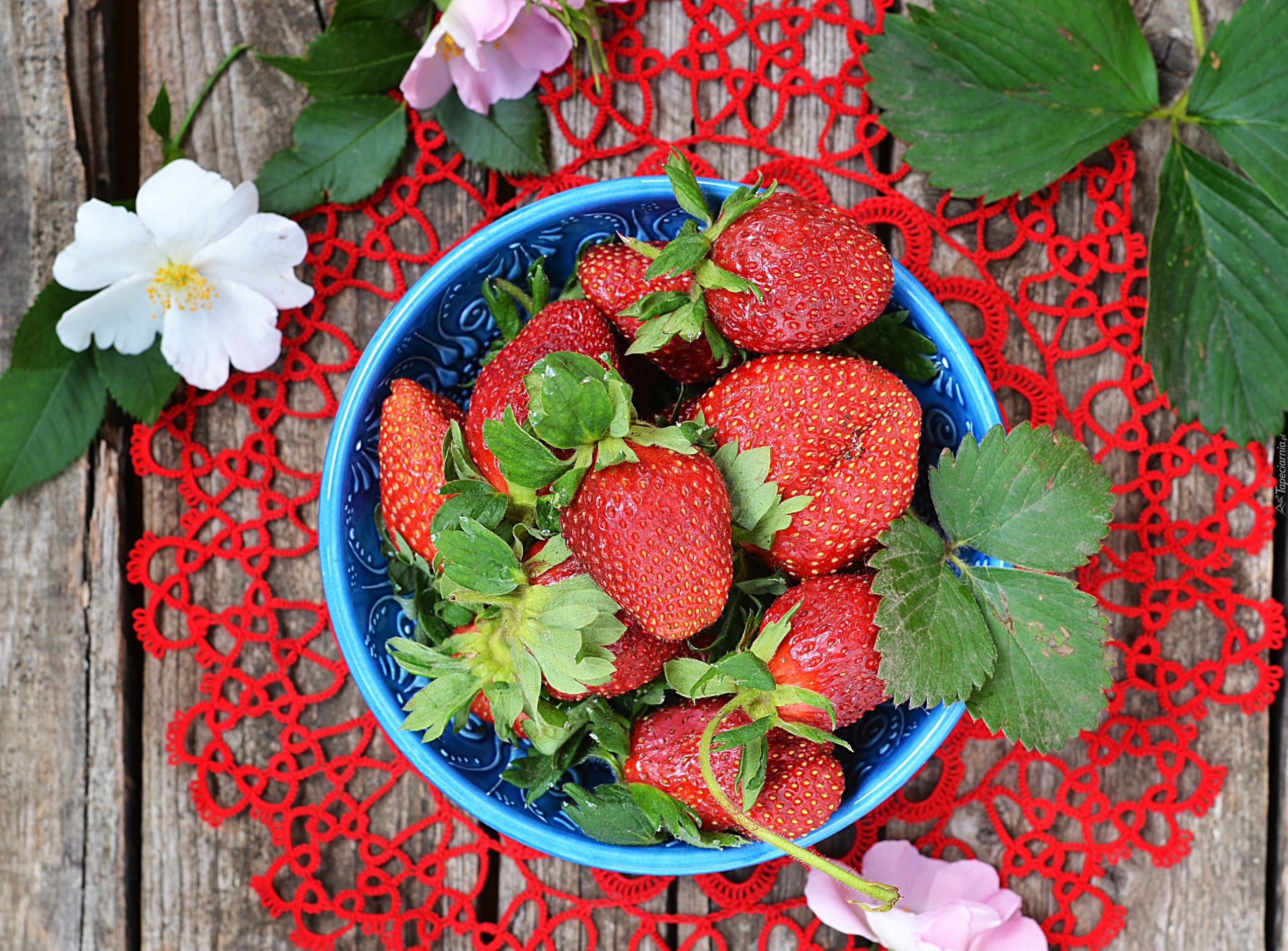 Edytor tapety: Truskawki, Liście, Miska, Serwetka, Deska, Kwiaty