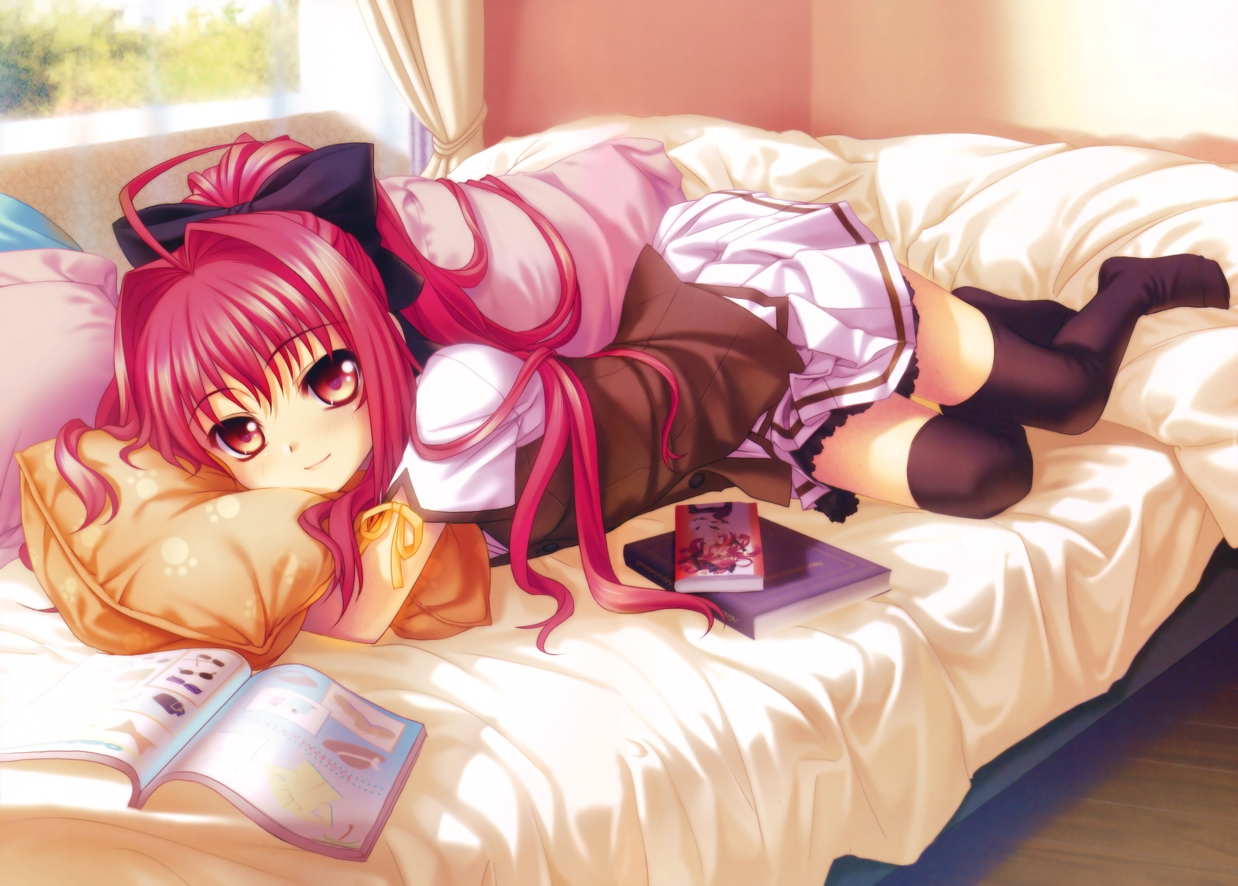 Edytor tapety: Dziewczyna, Łóżko, Pościel, Poduszka, Książki, Okno, Manga, Anime