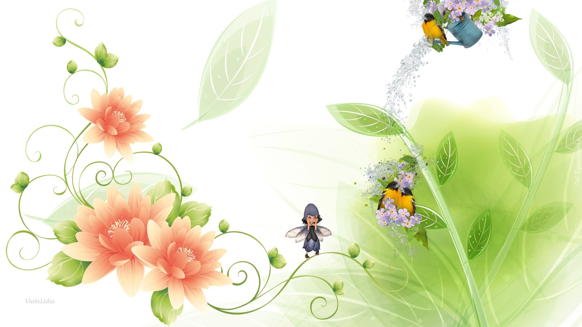 Edytor tapety: Grafika, Ptaki, Laleczka, Kwiaty, Liście