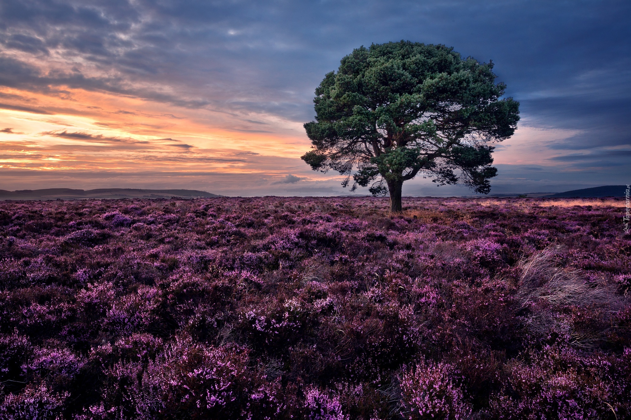 Edytor tapety: Drzewo, Wrzosowisko, Zachód Słońca