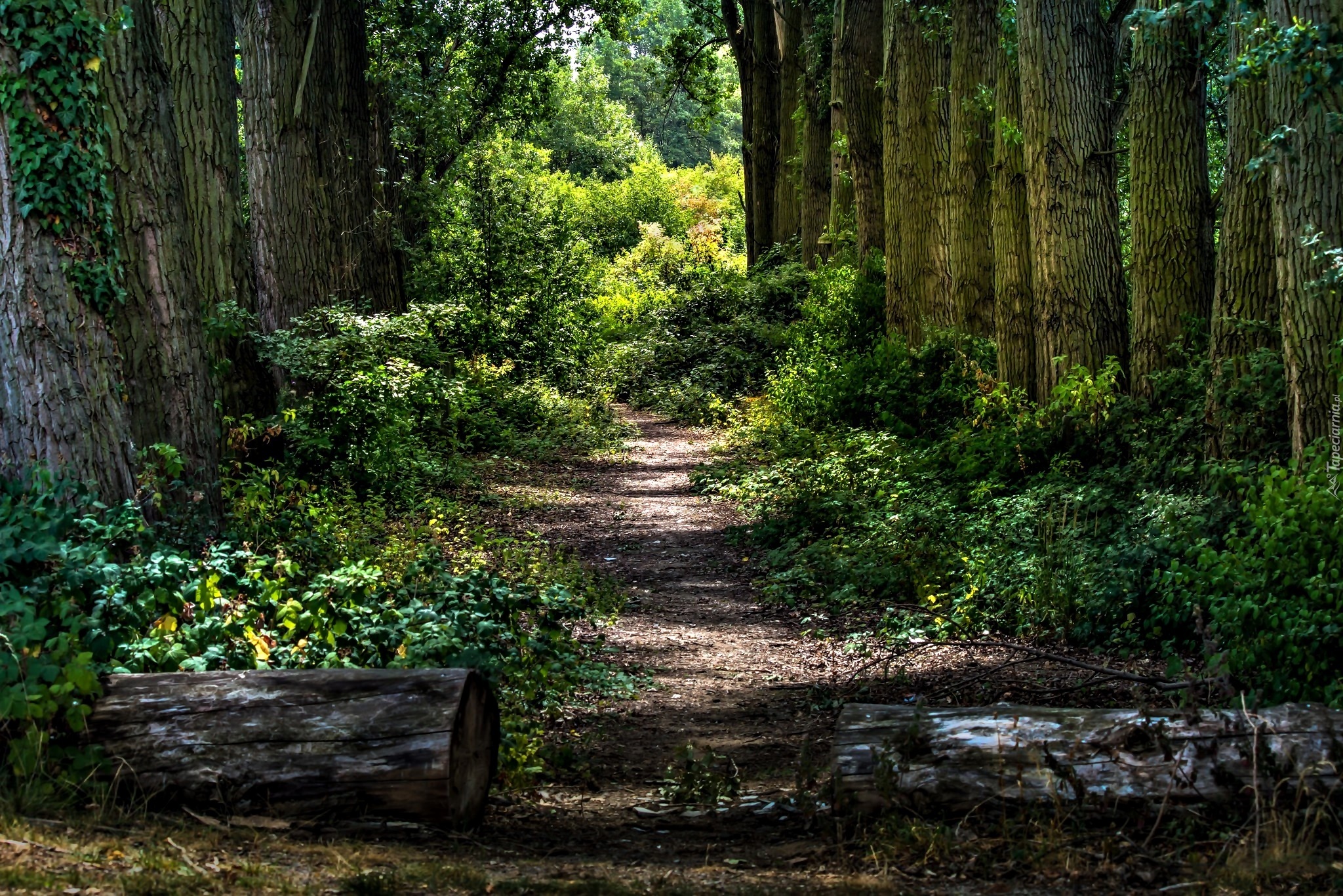 Edytor tapety: Las, Ścieżka, Kłody, Przebijające światło