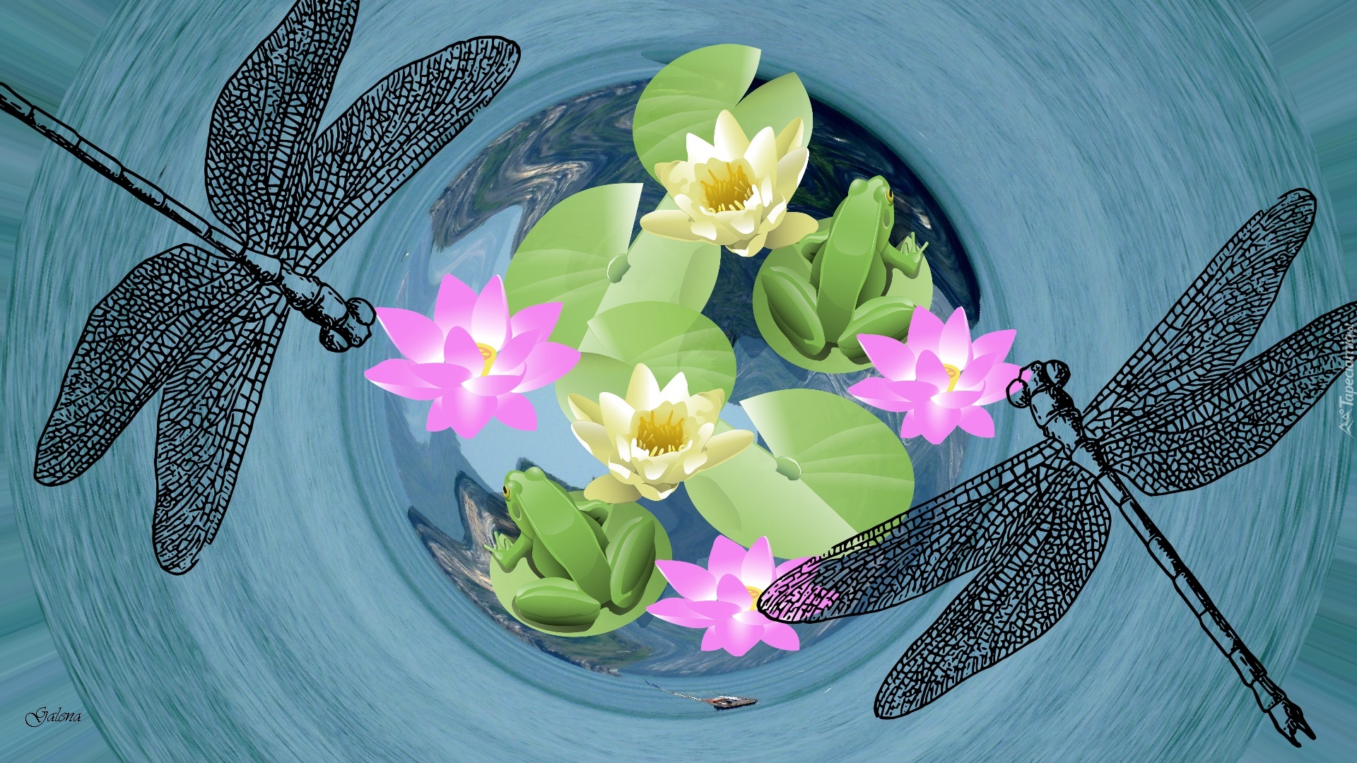 Edytor tapety: Wazki, Stawik, Lilie Wodne, Żaby, Grafika