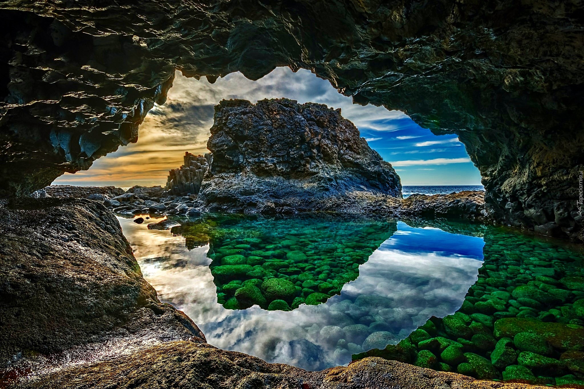 Edytor tapety: Wybrzeże, Jaskinia, Skały, Woda, Kamienie, Odbicie